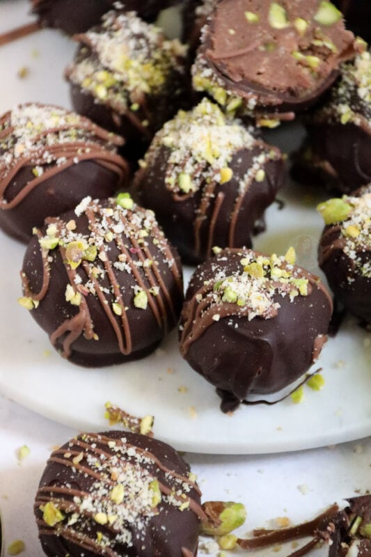 Amaretti, pistachio and rum together is a great combination as you have a chocolatey, slightly boozy truffle with the added texture of the amaretti biscuits and pistachios – they feel so decadent when you eat them! On one hand you want to savour them but on the other hand (which is always me) you cant get enough and must try all the toppings and before you know it, I’m making another batch!