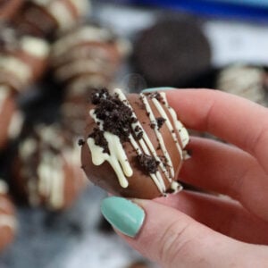 You can add whatever decoration you like! I personally like to keep mine simple with a drizzle of white chocolate and some Oreo biscuit crumb for some extra crunch! You can use milk or dark chocolate as your drizzle or you can of course leave them plain – your truffles, your choice!
