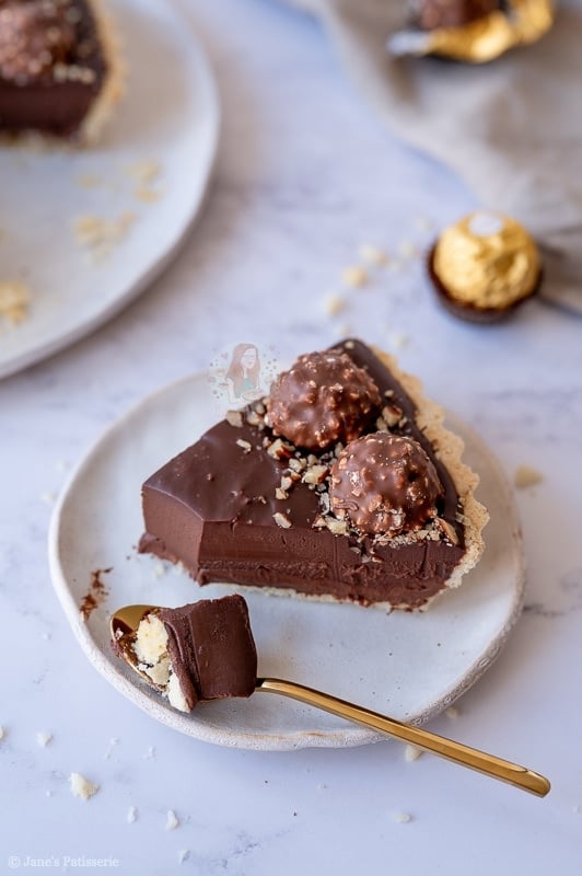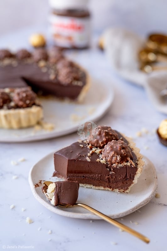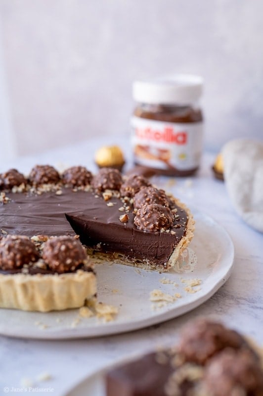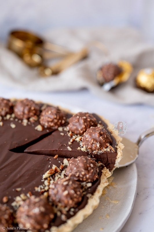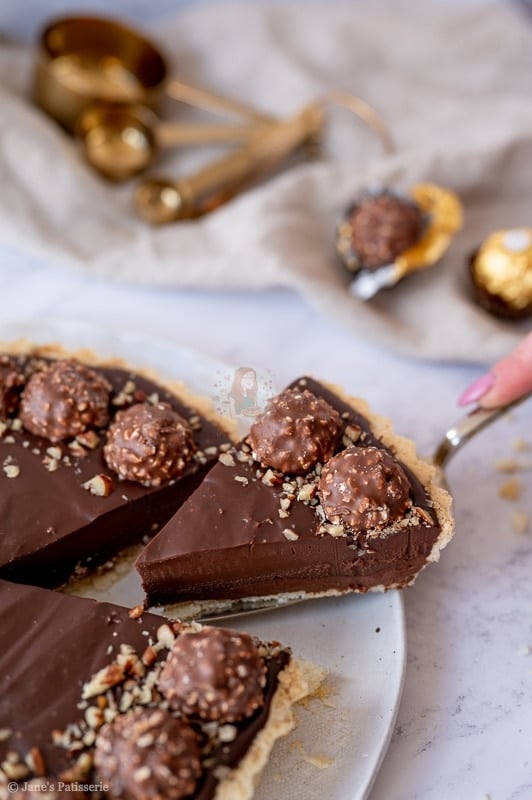A sweet shortcrust pastry base, with a layer of Nutella, a chocolate ganache filling with Ferrero Rocher – a delicious Ferrero Rocher & Nutella tart!