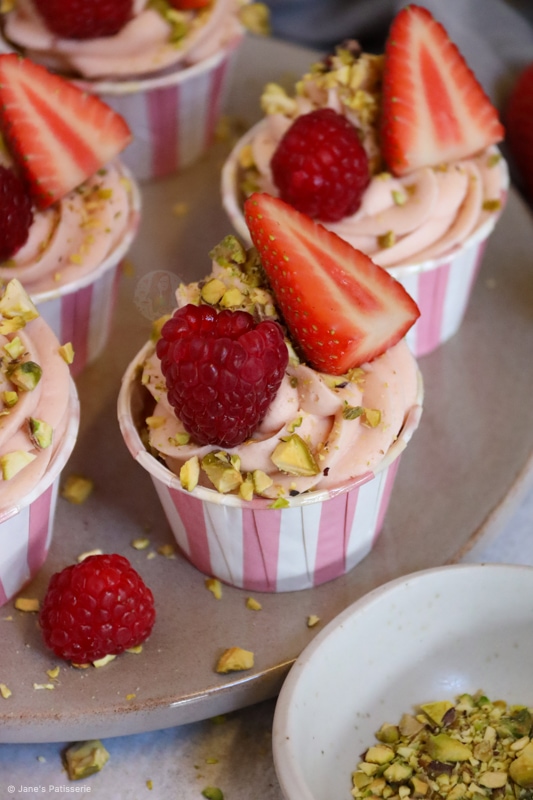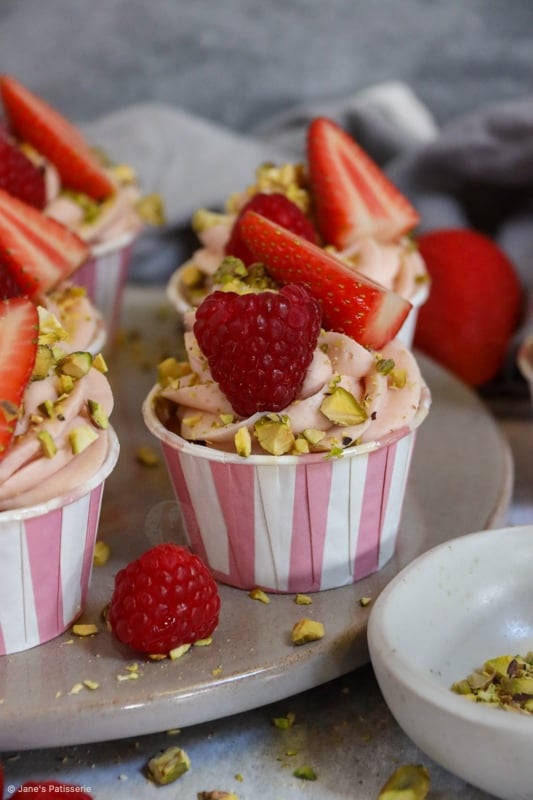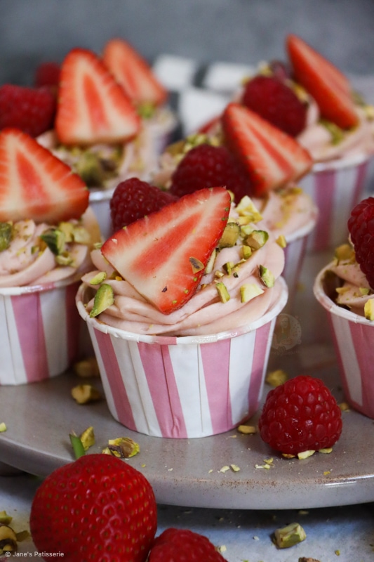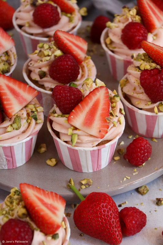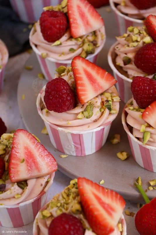 Decorating cupcakes like these berry & pistachio cupcakes is so easy as you have a beautiful palette of colour to work with. The berry colours from the buttercream frosting, which I swirl on with a large piping bag and 2d closed star piping tip, the berries, and the pistachios.