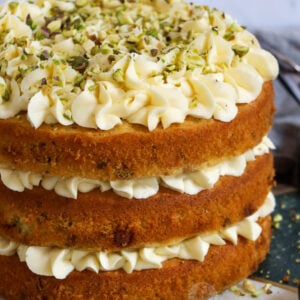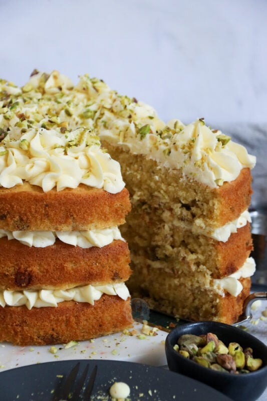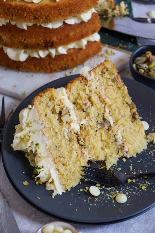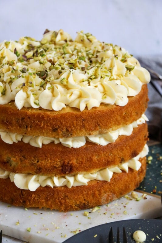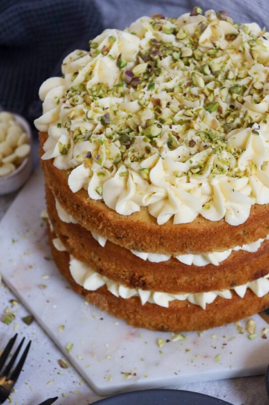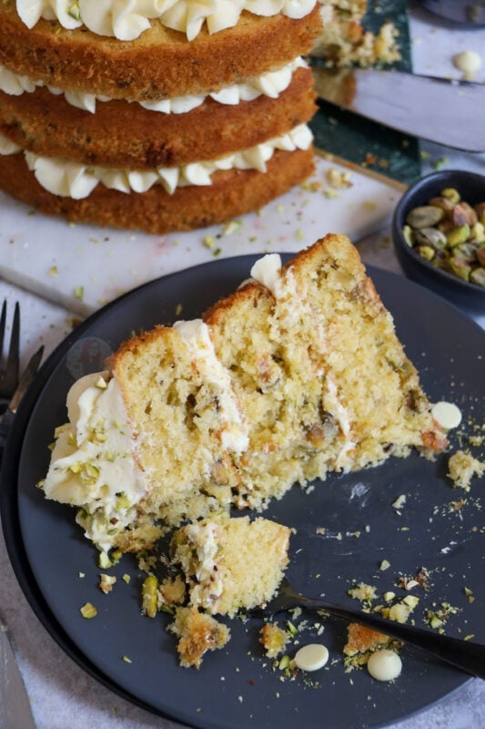 I tend to enjoy this sort of flavour cake or my carrot cake as a treat with a cup of tea! I decided to add pistachios to the sponge of this recipe as I wanted a bit of crunch! Added bonus is that the green of the pistachios with the delicate sponge and white chocolate buttercream looks pretty!