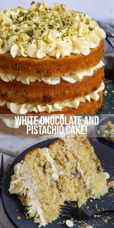 Three layers of white chocolate and pistachio sponges, with white chocolate buttercream, and even more pistachio!