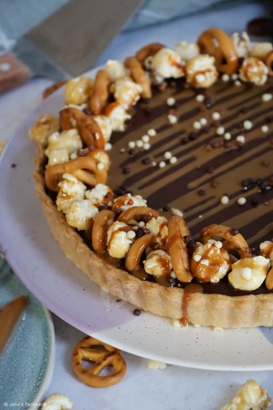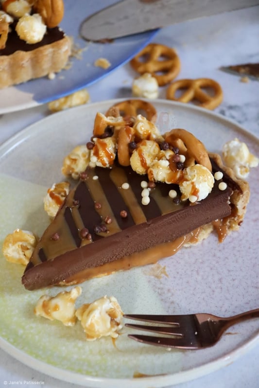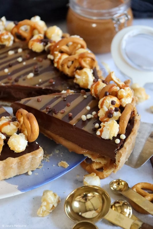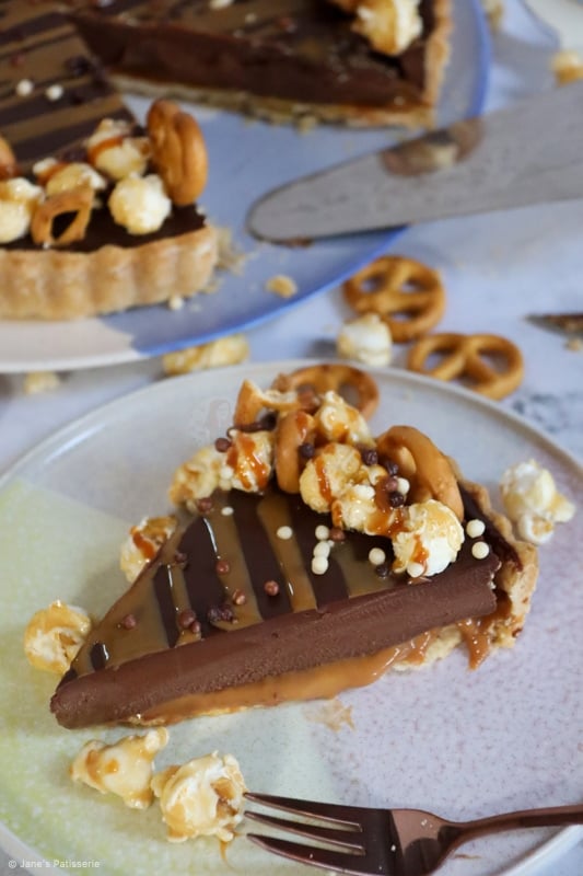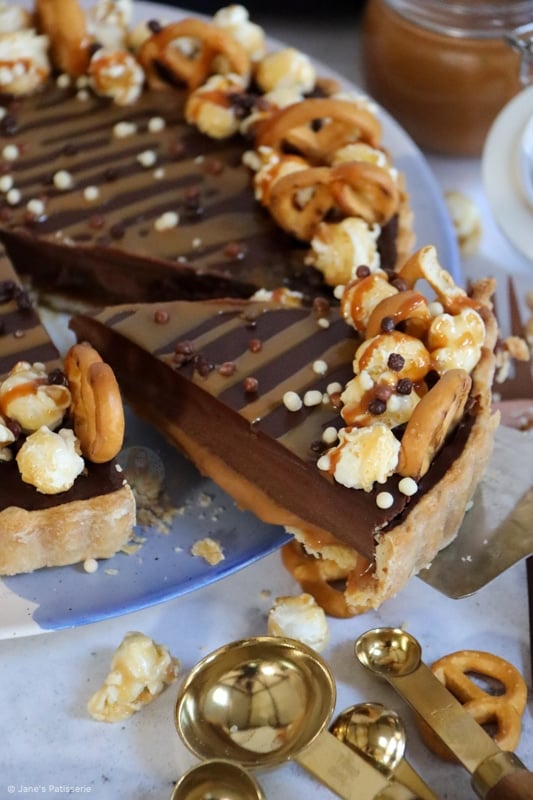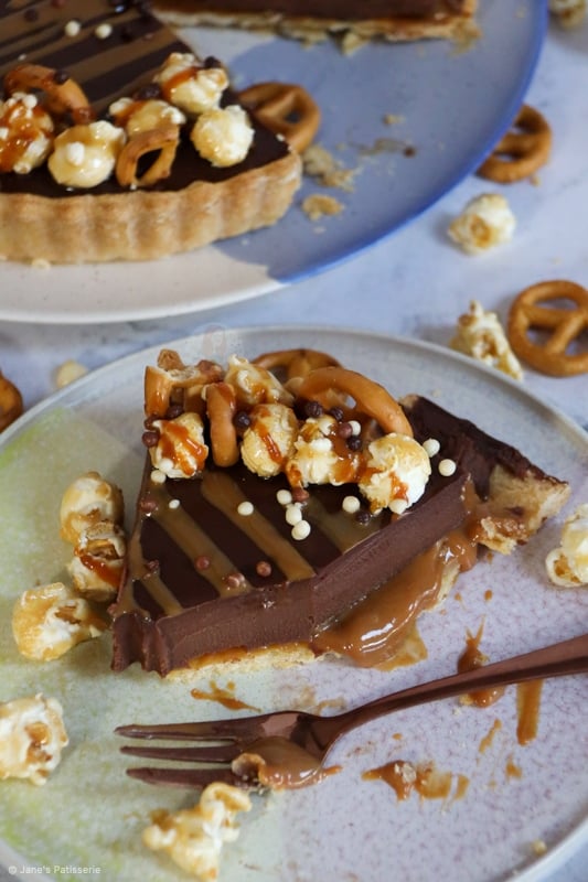 This recipe has a DELICIOUS sweet and thin pastry base and sides, with a scrumptious salted caramel layer, topped with the most delicious chocolatey ganache filling – so unbelievably tasty a combination.