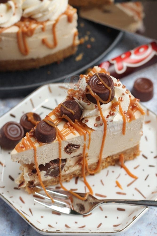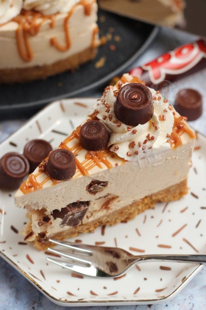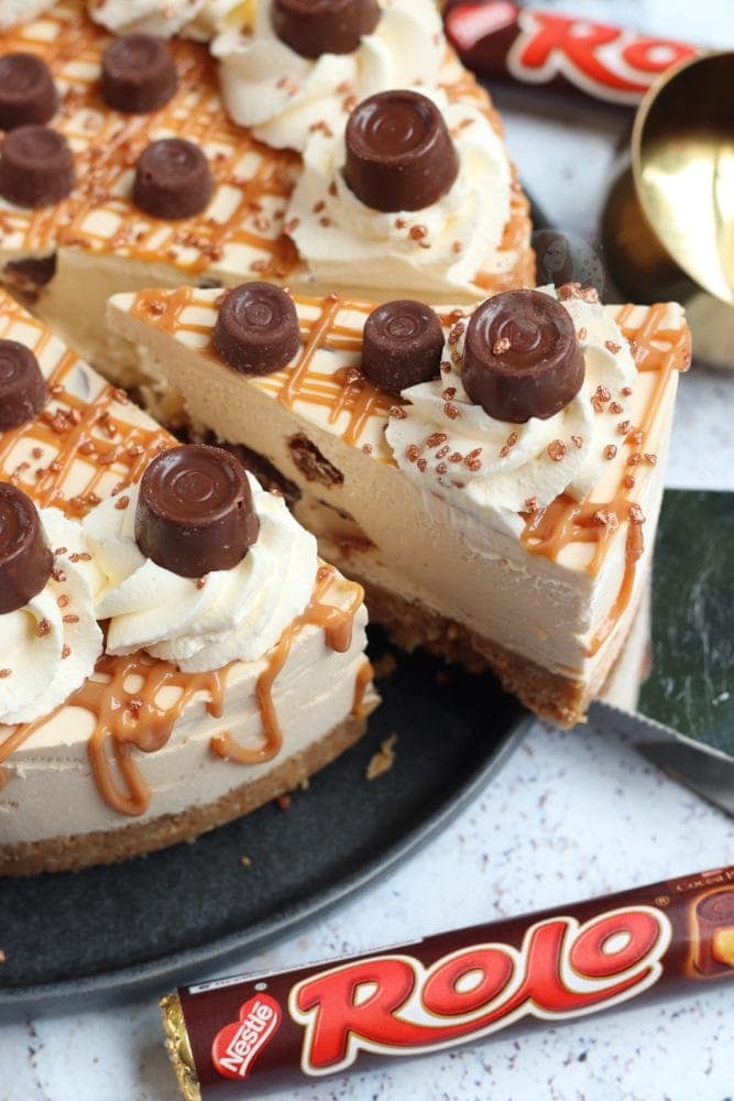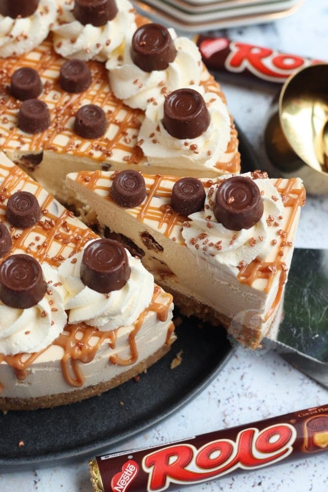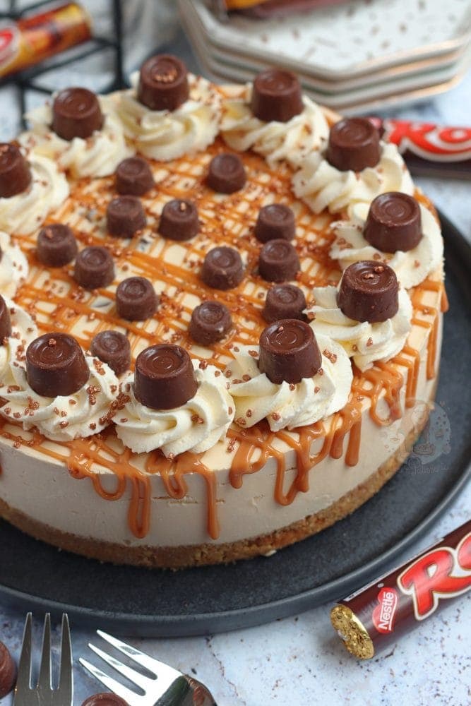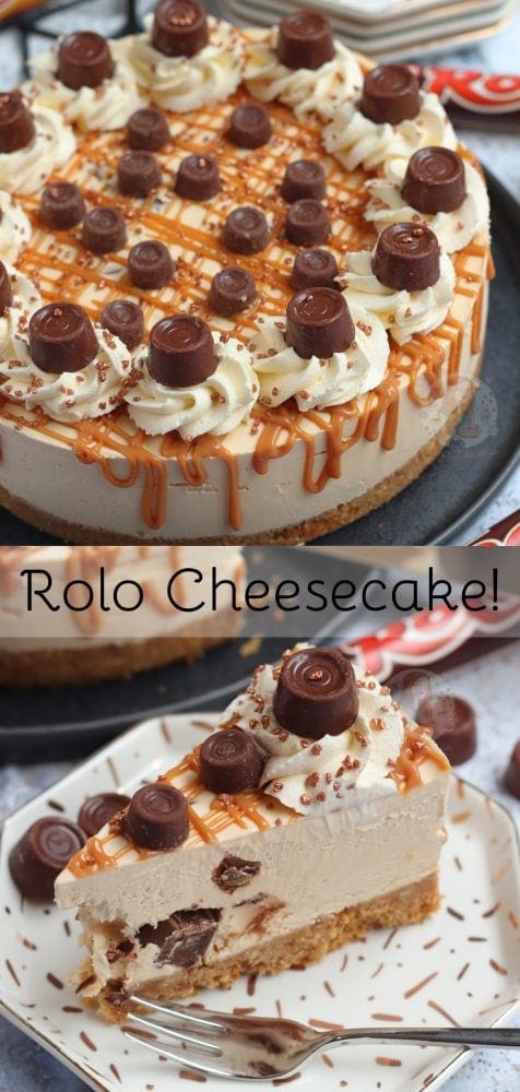 A delicious no-bake caramel Rolo cheesecake, with a buttery biscuit base, caramel & Rolo cheesecake filling, and even more delicious Rolo themed topping!