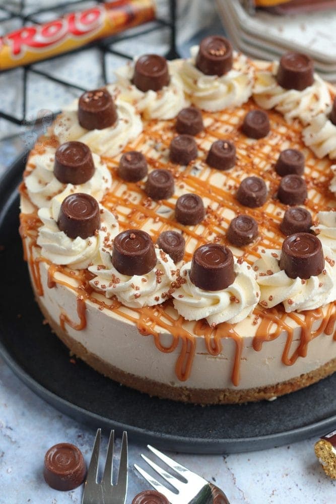 - Drizzle the cheesecake with some caramel and pipe the whipped cream around the edge – sprinkle on some Rolo’s and sprinkles.