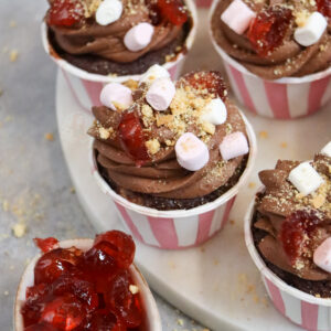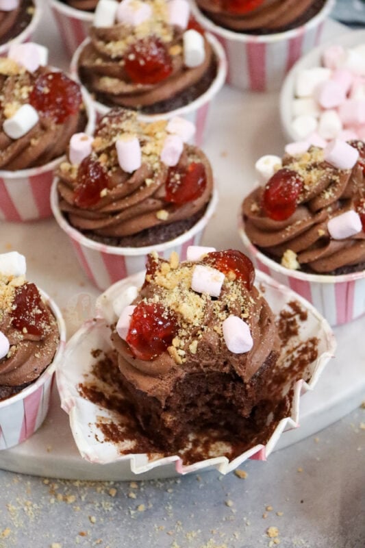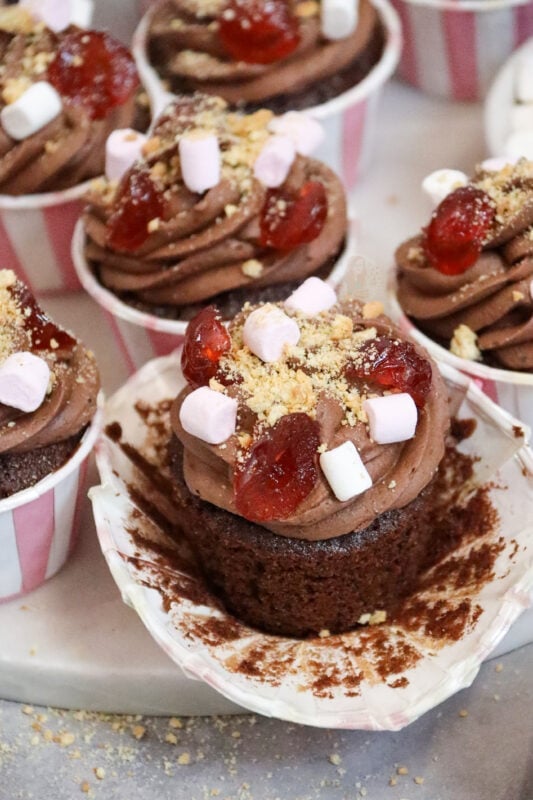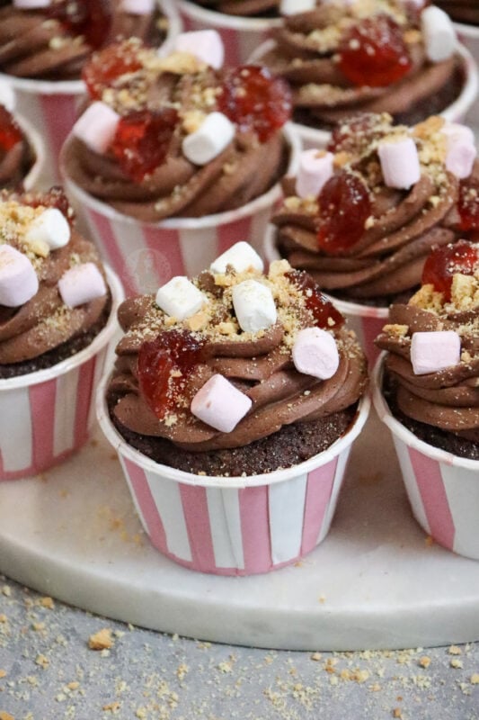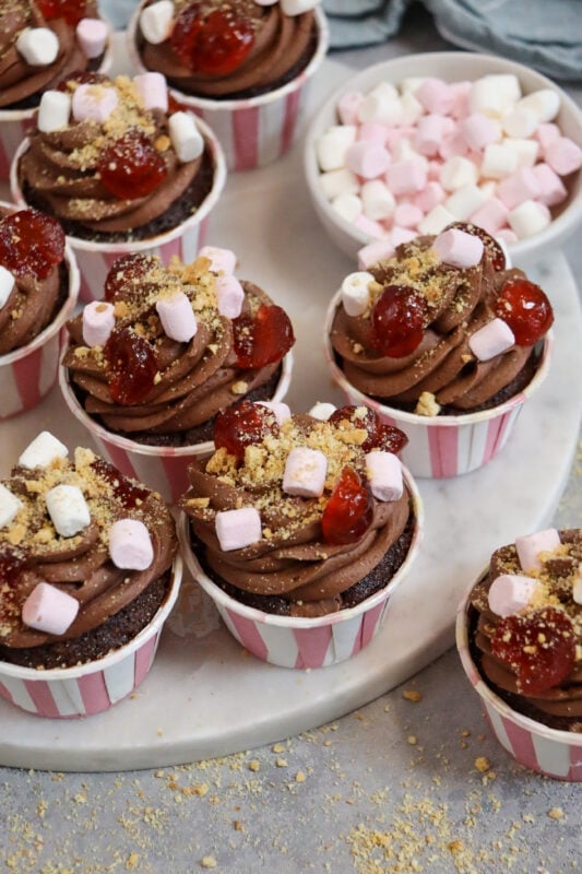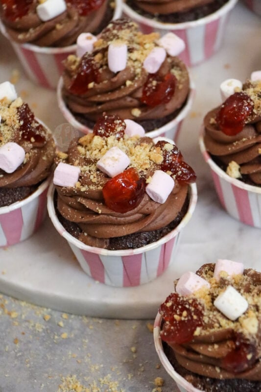 I decorate my rocky road cupcakes with what people like about their favourite version of rocky road – mine is mini marshmallows, glacé cherries, and chopped biscuits. I do actually use some micro marshmallow sprinkles that I found in the shop, but normal mini marshmallows work!