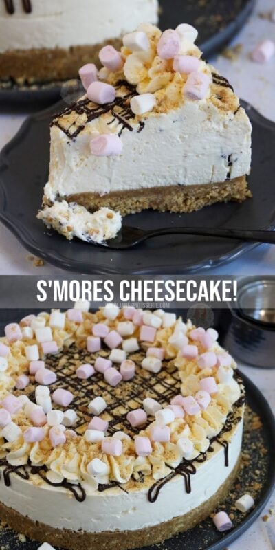 No-bake s’mores themed cheesecake with marshmallow fluff – topped with toasted marshmallows, crushed biscuits & melted chocolate!