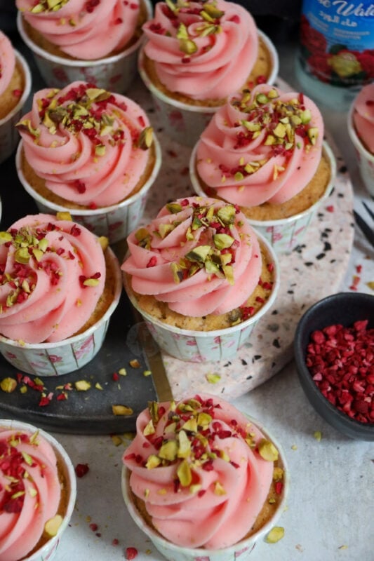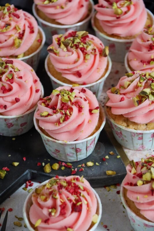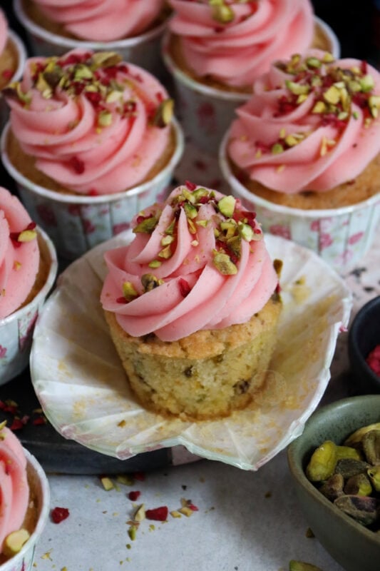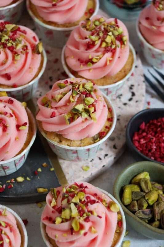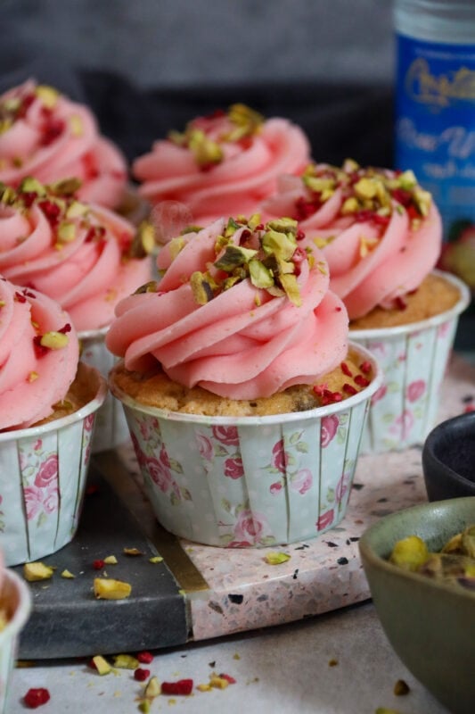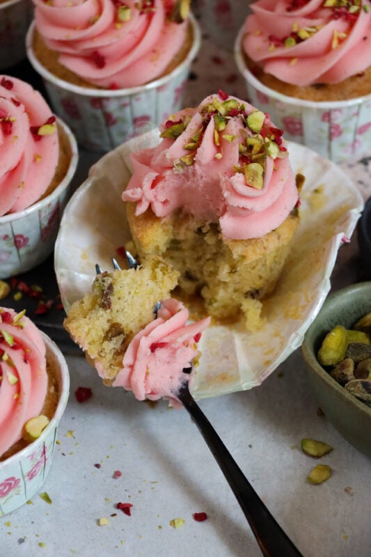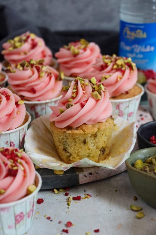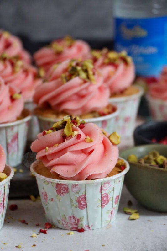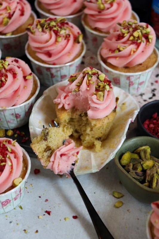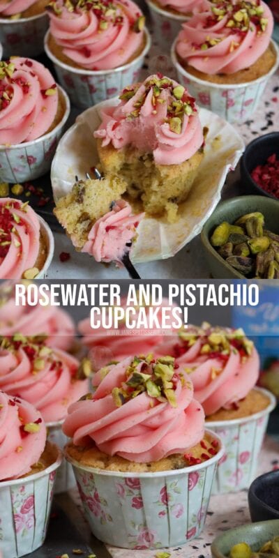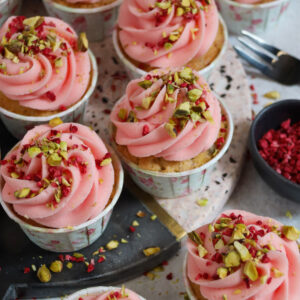 Pretty in pink and green cupcakes with a lovely hint of rosewater & pistachio!