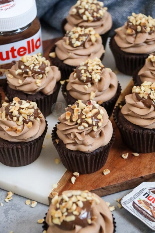 I then created a Nutella buttercream to go on top, and topped that with some extra hazelnuts and a piece of Kinder Bueno! Honestly, you can change this up if you wanted… anything chocolate or hazelnutty would taste great!