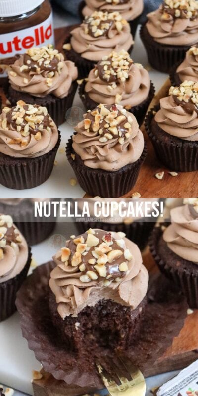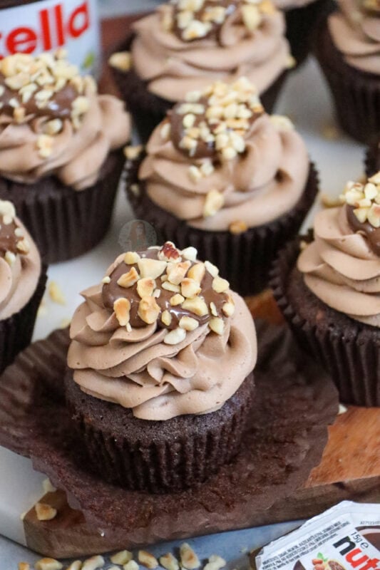 Chocolatey cupcakes dotted with hazelnuts, topped with a creamy & delicious Nutella buttercream frosting with Kinder Bueno… amazing Nutella cupcakes!