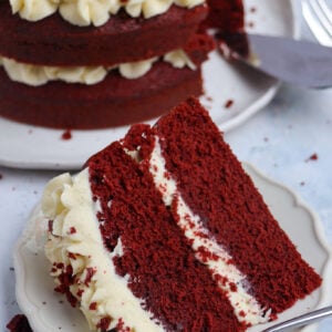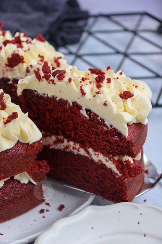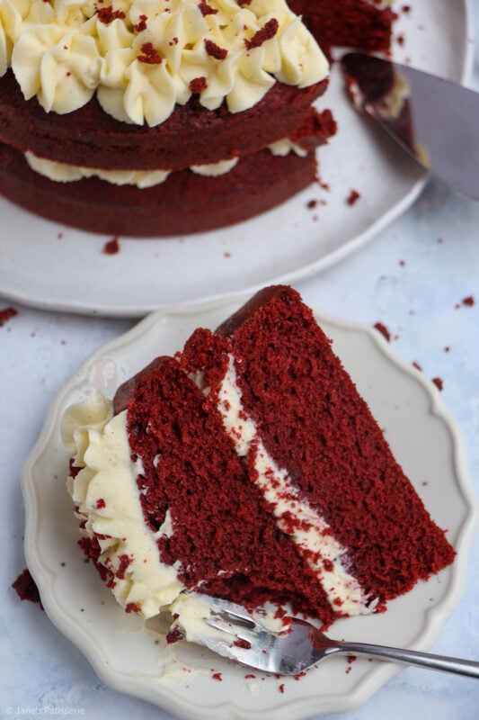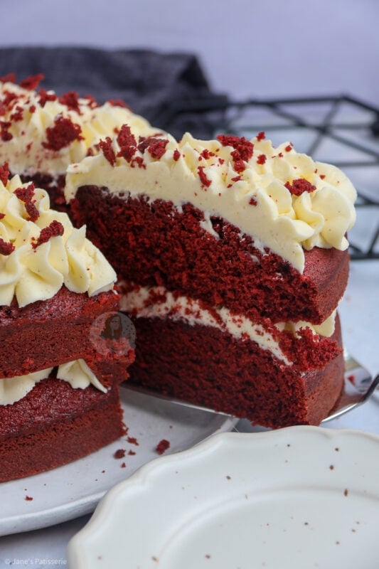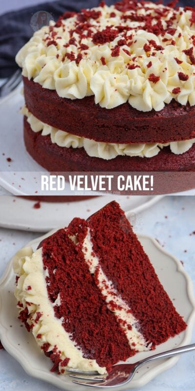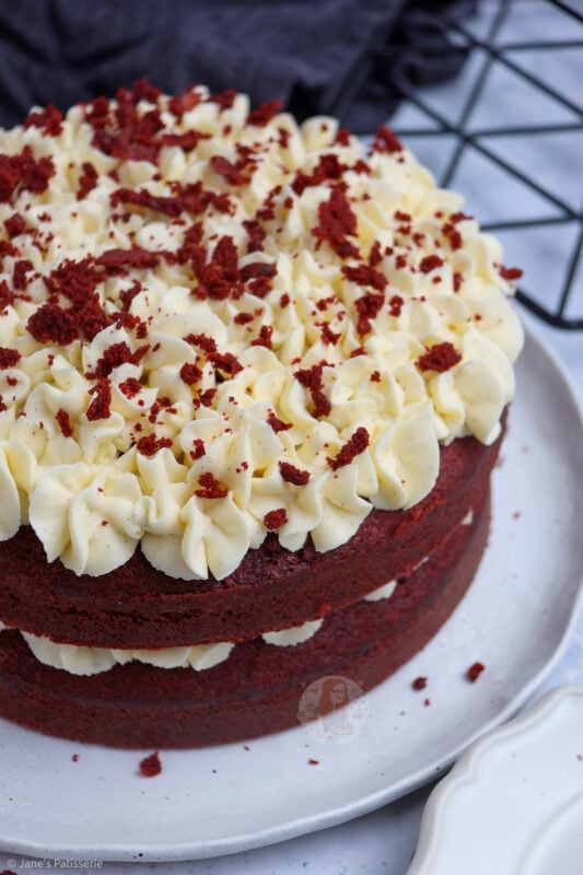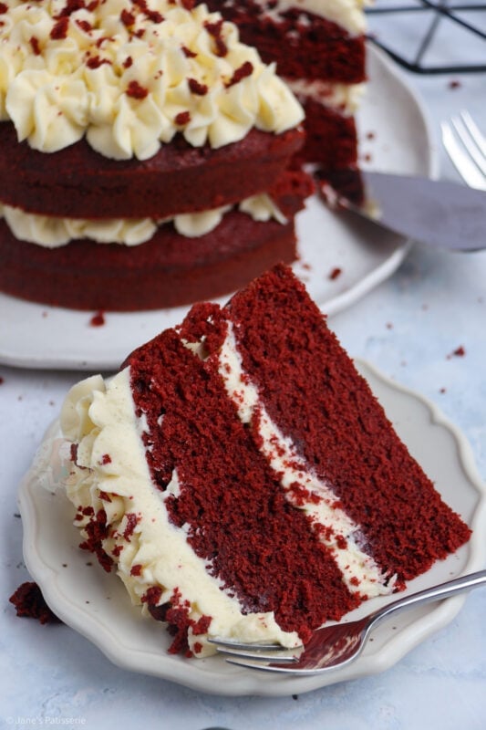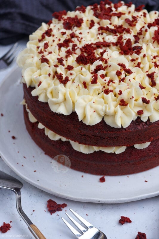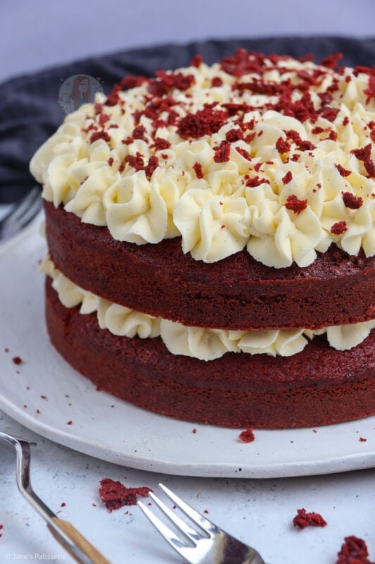 A delicious & light and moreish red velvet cake smothered in cream cheese frosting – hello cake heaven!