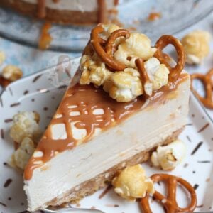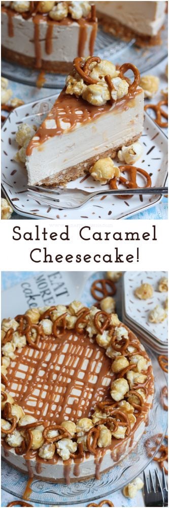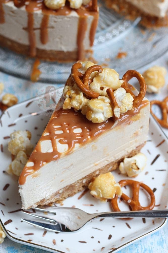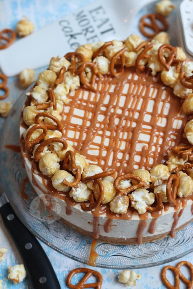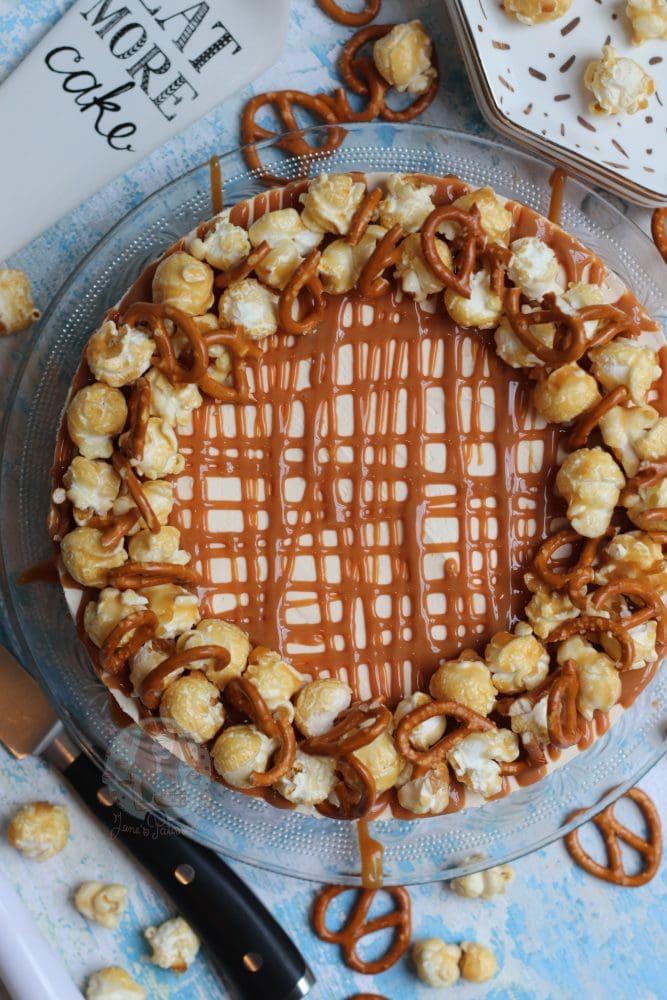 A delicious No-Bake Cheesecake packed full of a Salted Caramel Cheesecake filling with Pretzels & Popcorn! – A delicious dessert perfect for every occasion!