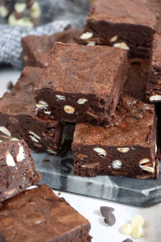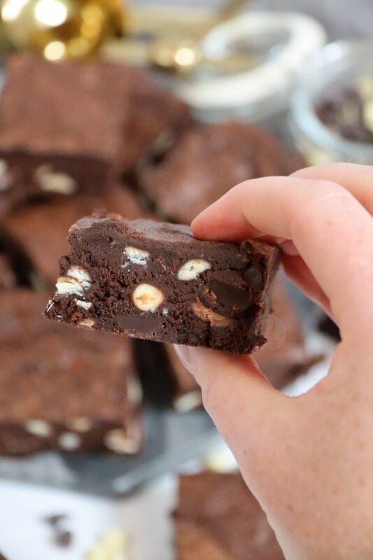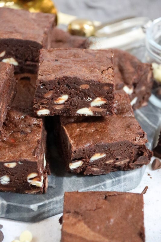 - Melt the butter and dark chocolate together and leave to the side too cool. Whisk in the light brown sugar until combined. Whisk in the eggs until fully combined and then add the vanilla, cocoa, baking powder and ground almonds until fully combined. Stir in the white chocolate chips and pecans, then pour the mixture into the tin and bake in the oven for 30 minutes. Leave too cool fully in the tin or in the fridge overnight.