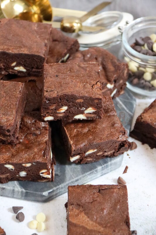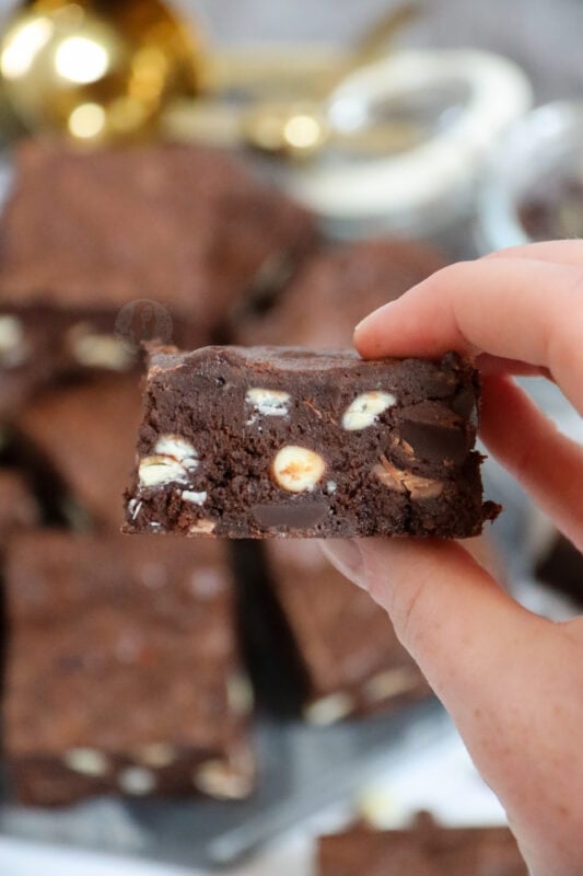I love loads of chocolate chips in my brownies, but my mum for example, being the fuss pot she is, can sometimes hate a super chocolatey brownie… but she doesn’t moan with these!