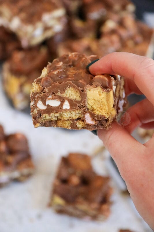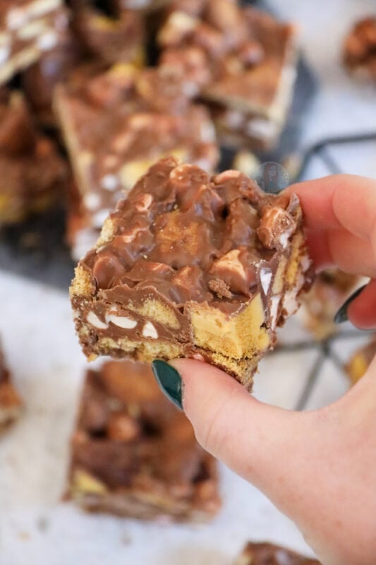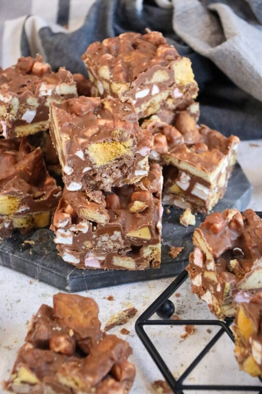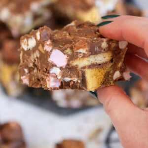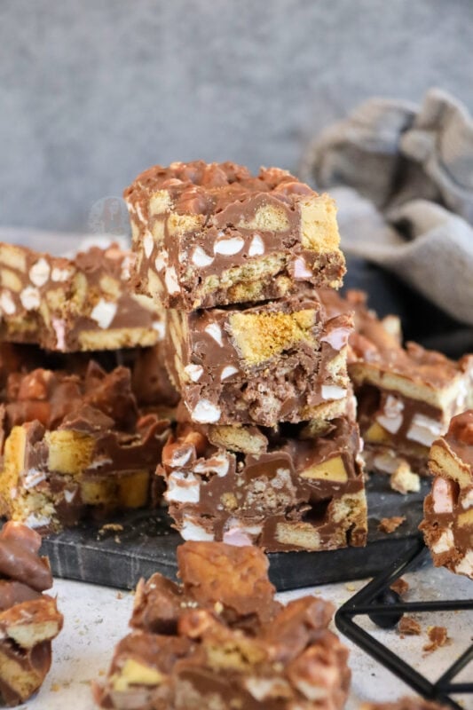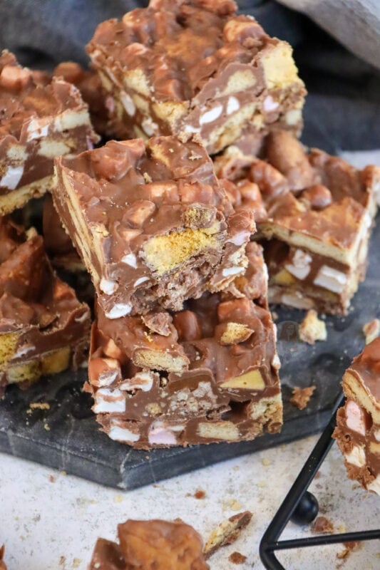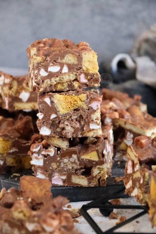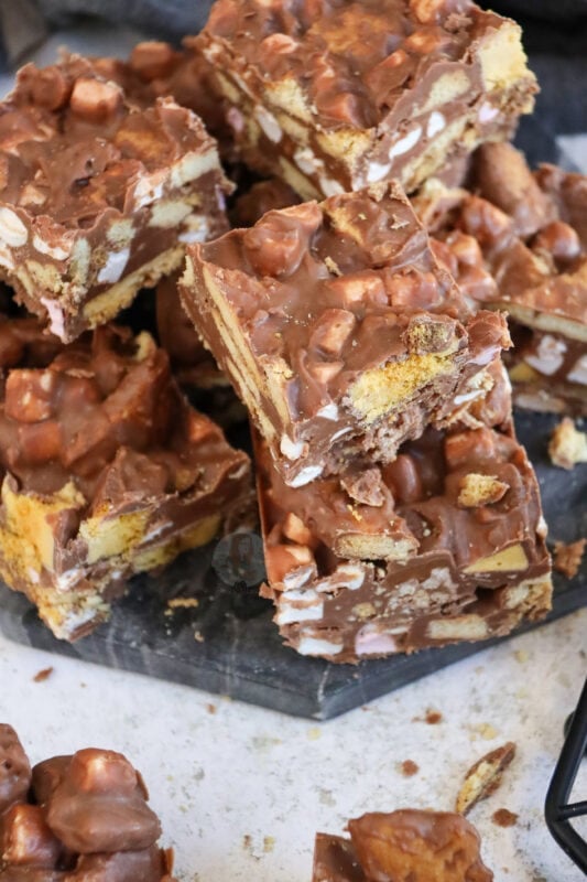 Now, I know for a fact you guys love a rocky road recipe, like my Kinder Bueno rocky road, Terry’s chocolate orange rocky road, Biscoff rocky road, and my Mint Aero rocky road. As you can tell, I also love myself a rocky road recipe!