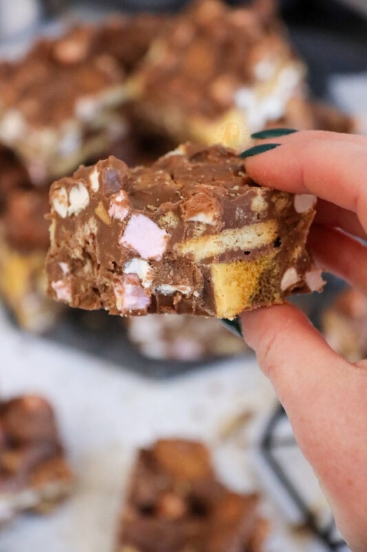 I adore making other classic traybakes like brownies, blondies, a tiffin, or even a cookie bar… but I would genuinely say rocky road is one of the easiest, and one of the best. We all know I adore anything classic so here is one of my favourite recipes ever.