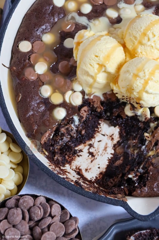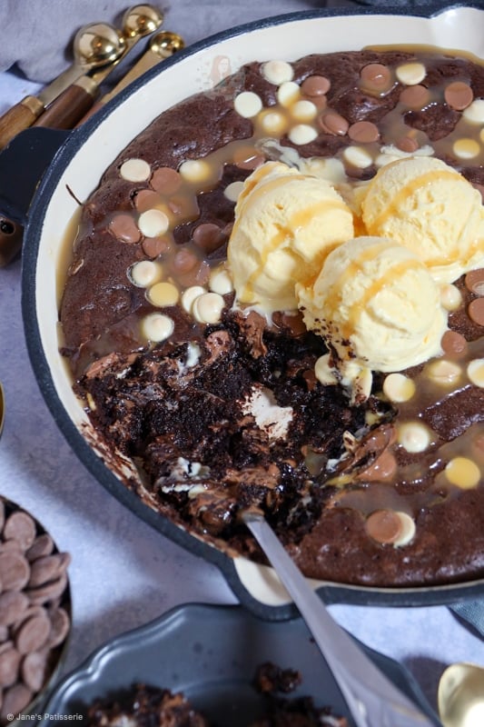 - Leave to cool slightly - If serving immediately, dollop over some ice cream of your choice (I used salted caramel Ice cream) and drizzle with melted chocolate! Enjoy!