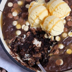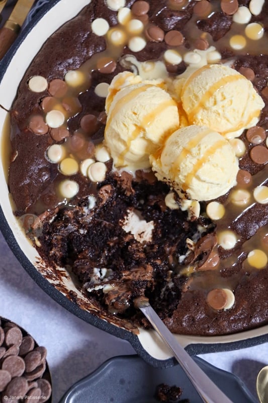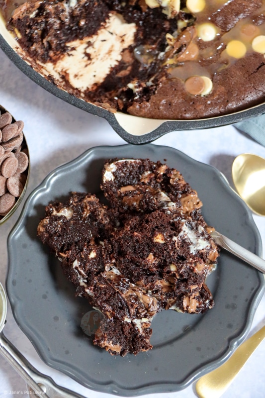 You guys LOOOVE my regular triple chocolate brownies recipe, and this is essentially the skillet version. The recipe basics are the same because they are perfect, delicious and super chocolatey.