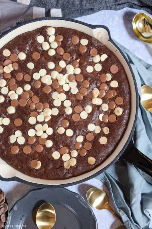 But anyway… this led me to post this recipe. I have always loved cooking and baking in a skillet, but a brownie in a skillet is just delicious! Like, I’d eat it all to myself with a spoon happily. My skillet is enamled and I adore it