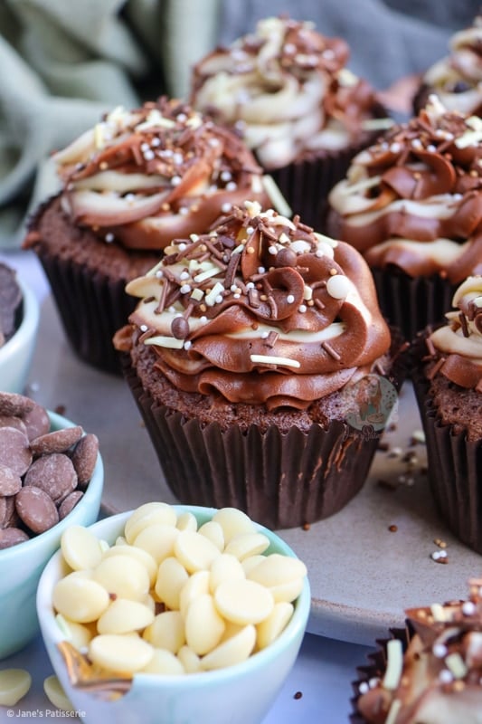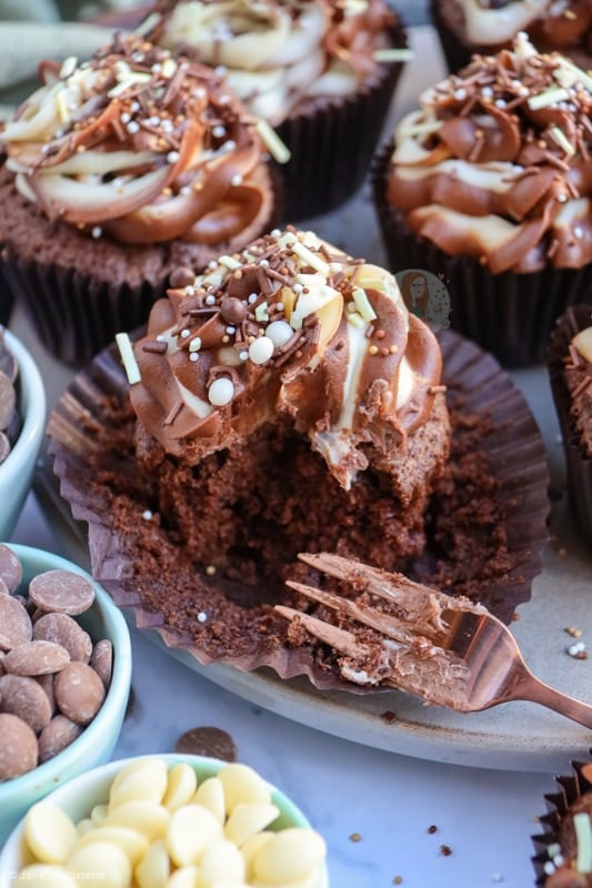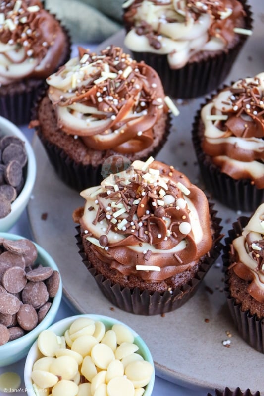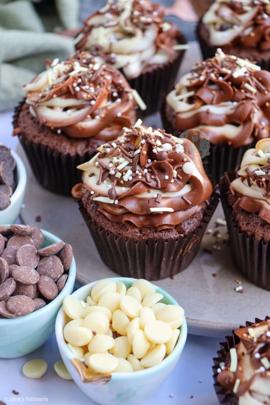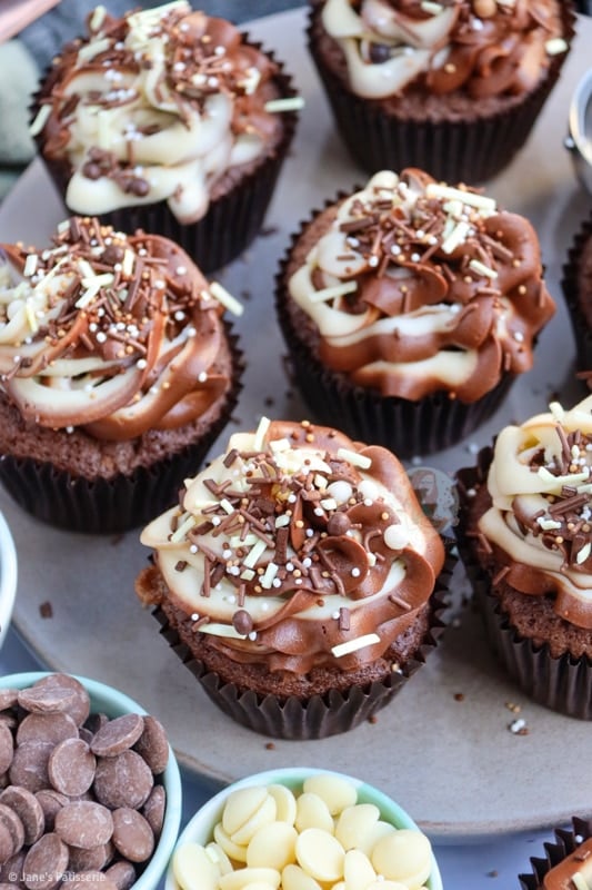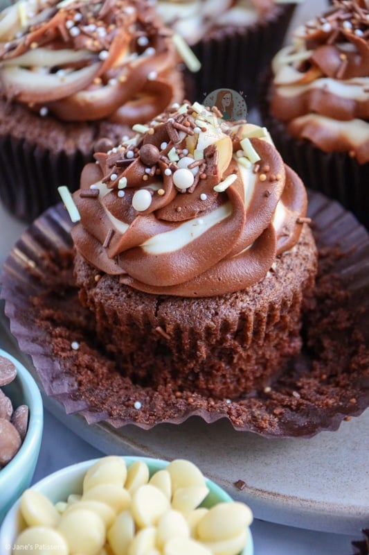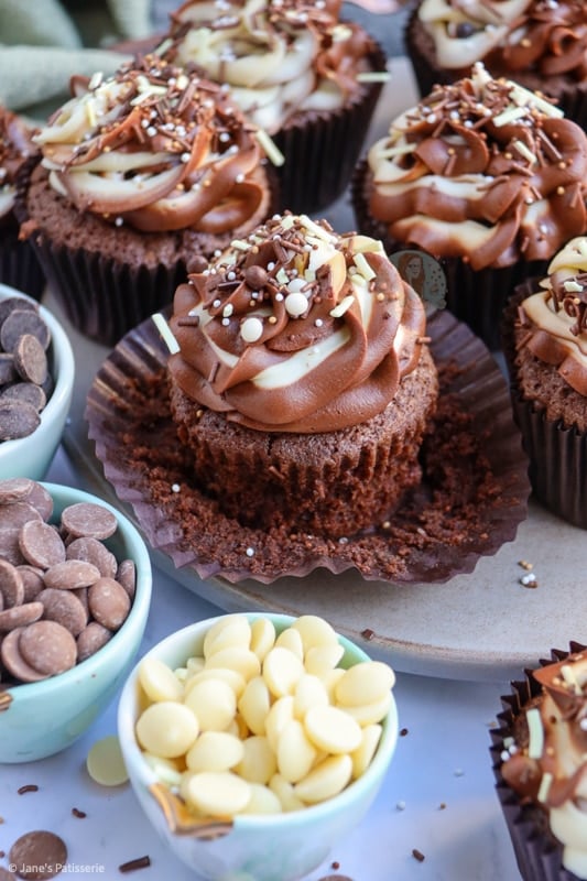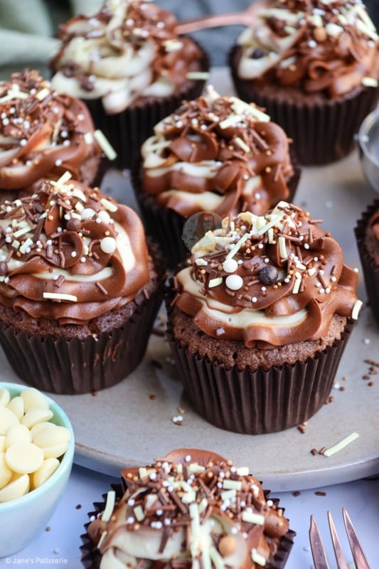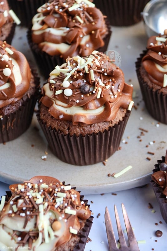 Using the dual flavour and tonal buttercream just brings a bit more of a show stopping element to the cupcakes, and no-one is going to complain about even more chocolate right?! They are just SO good. You can of course switch up the chocolates to a dark chocolate sponge, or even a triple chocolate buttercream if you fancy.