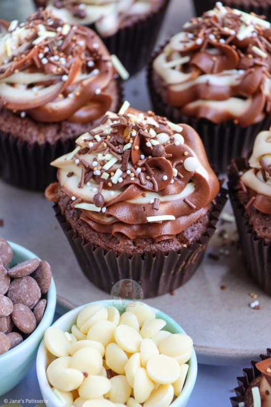 Hi Jane, I have made these a few times and each time I have had a problem with the buttercream. I only use whole milk to the buttercream and it is a good texture when I put it into my piping bag. I’m able to ice around 4 cupcakes perfectly and then suddenly my icing starts coming out of the piping bag in strings, almost looking like spaghetti. Is it because the temperature of my hands holding the piping bag has altered the texture? I thought perhaps my nozzle was becoming clogged, but I use a nozzle that looks very similar to yours. When this happened last, I took the icing out of the bag and cleaned the nozzle and then put it into a new bag and it was fine. It doesn’t seem to happen when I make milk chocolate icing (I always use Cadbury) so I thought maybe it could be because I’m using cheap white/dark chocolate? Honestly I don’t know what I’m doing wrong so if anyone could help me that would be amazing!! instead of enjoying the decorating process I dread it because I’m just anticipating my icing to go wrong.