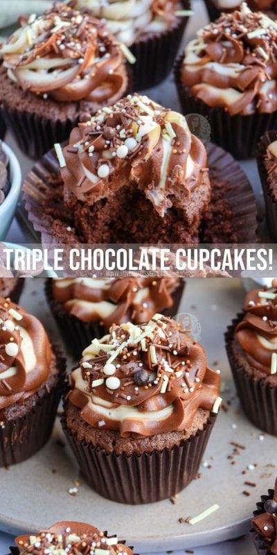 When you think of triple chocolate, you should understandably think of dark chocolate, milk chocolate, and white chocolate all combined in some form or another, and these triple chocolate cupcakes really are going to give you that.