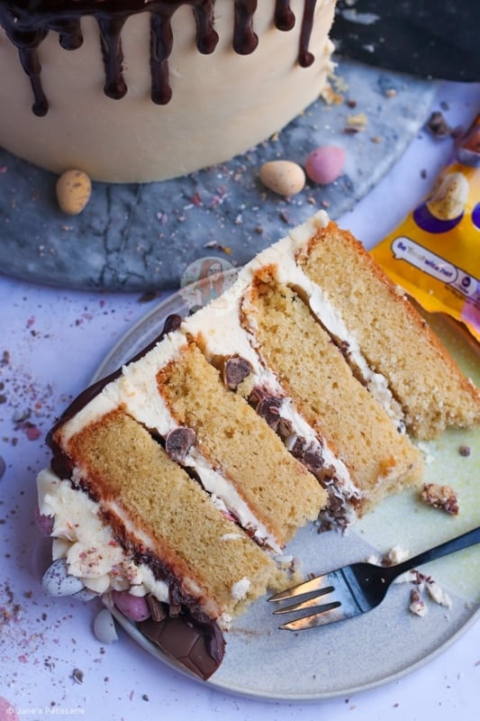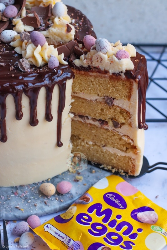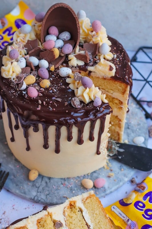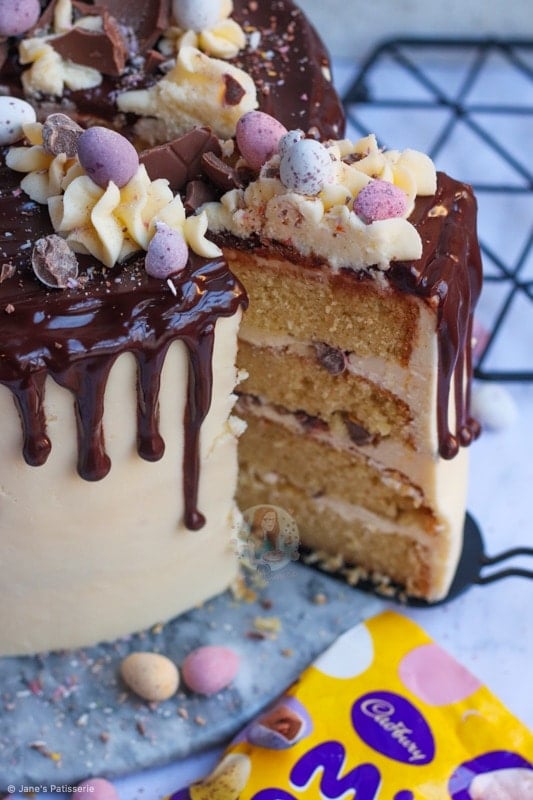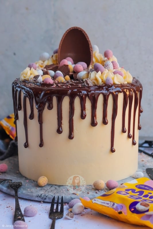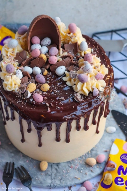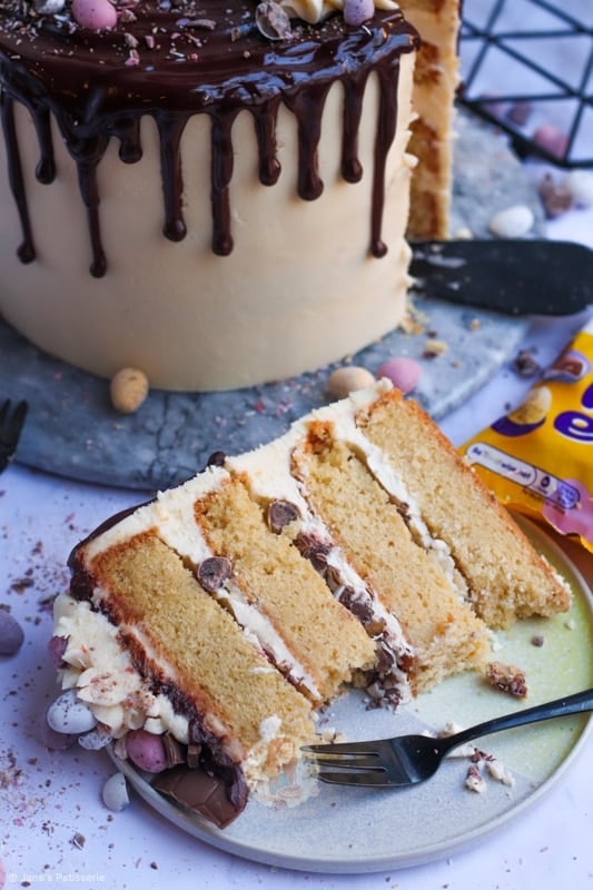A four-layer vanilla cake with vanilla buttercream frosting, mini eggs, a chocolate drip and more – the perfect mini egg cake showstopper!