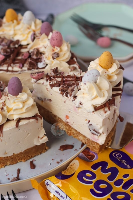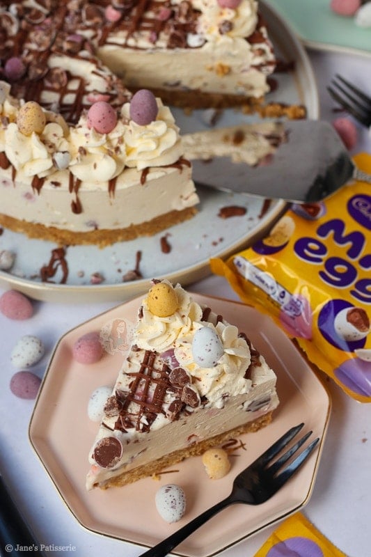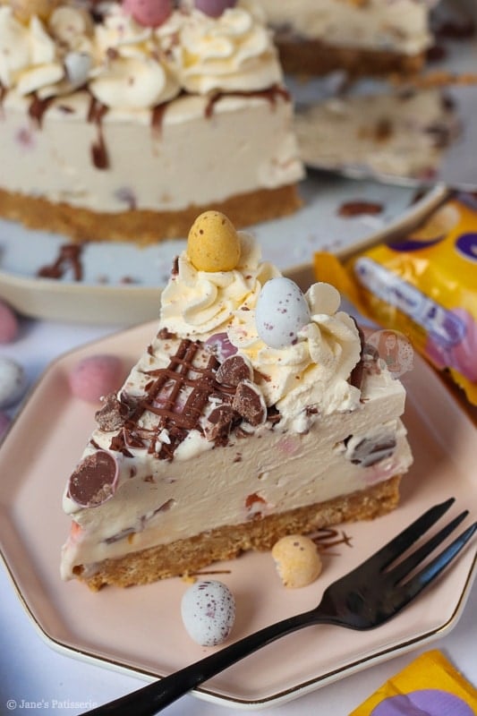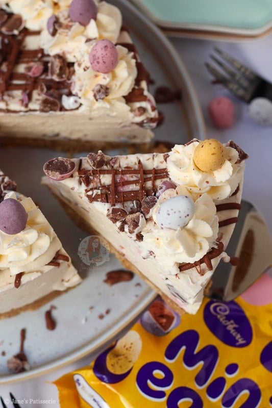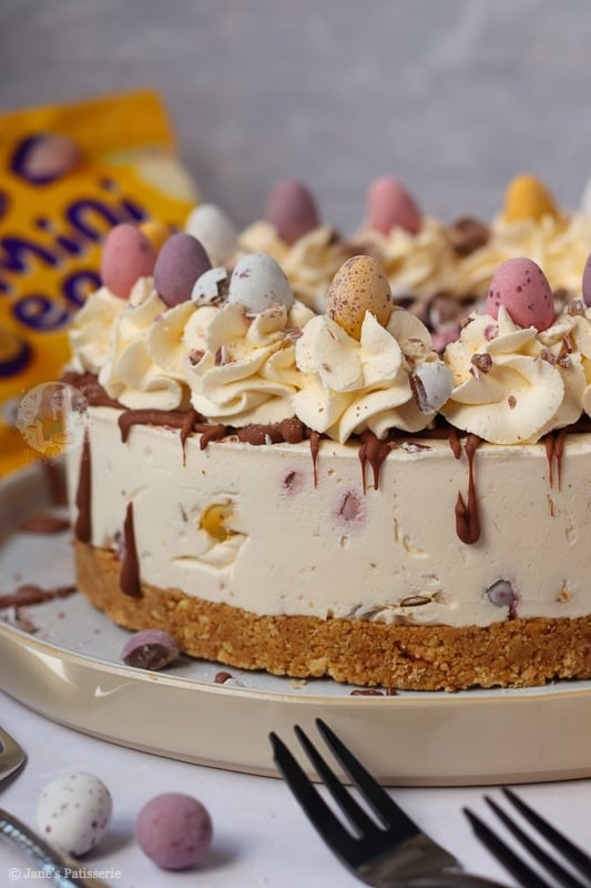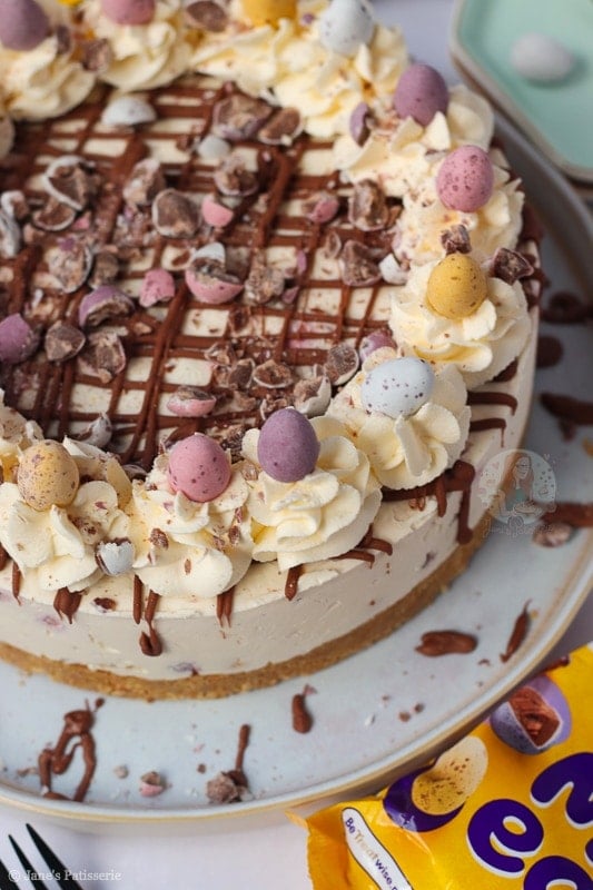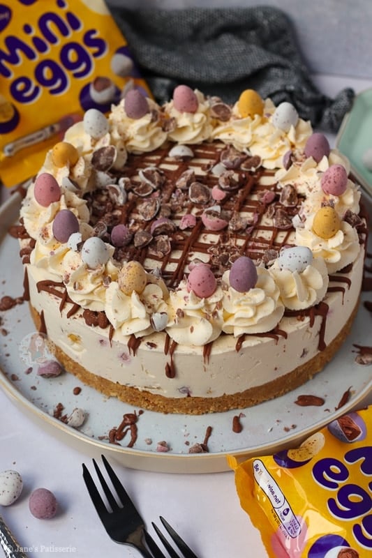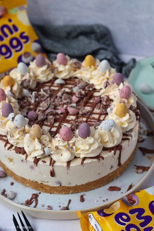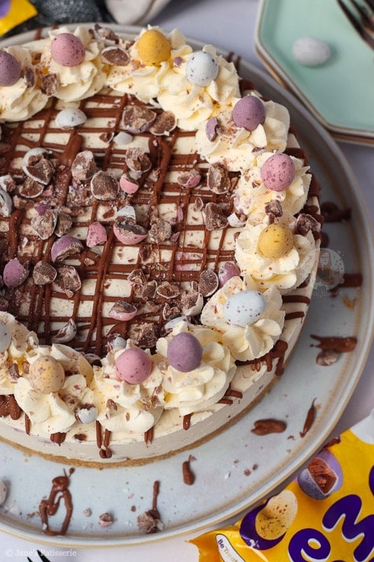Once the cheesecake has set fully overnight (or at least 5-6 hours in the fridge) you can remove it from the tin and happily decorate. I did a usual Jane’s Patisserie style decoration with a drizzle of melted chocolate, whipped cream swirls, and all the mini eggs.