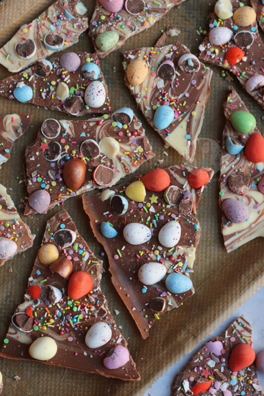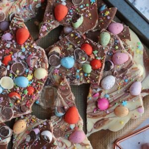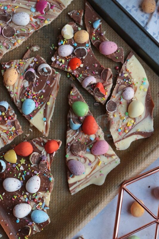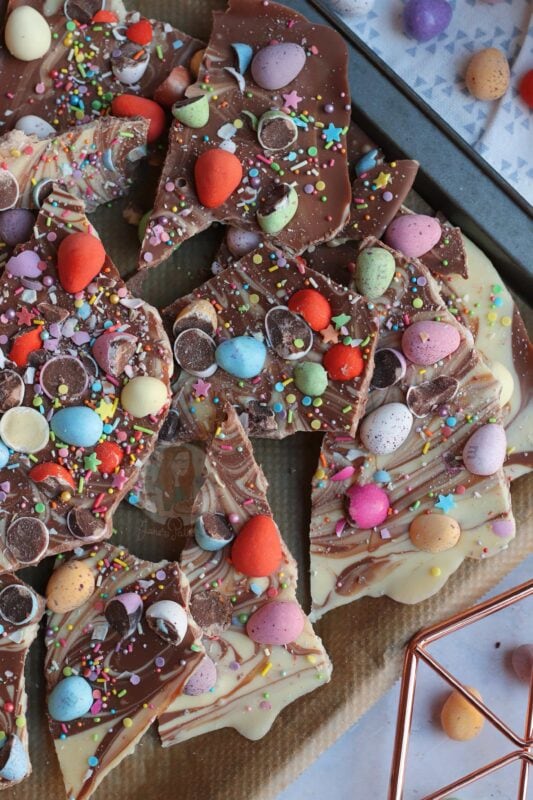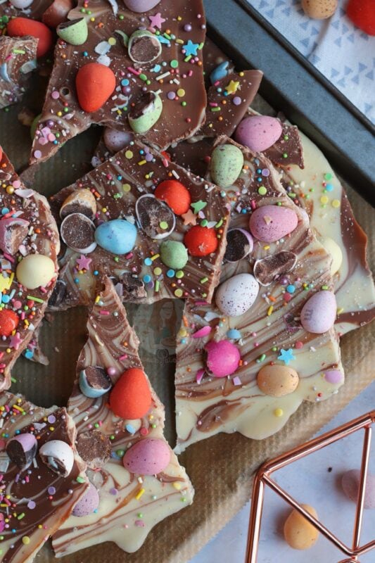 I tend to put half of each chocolate on the lined tray, and then swirl in the other half of each chocolate. Sprinkle over some whole and crushed Easter Chocolates and some sprinkles, and you’re done!!