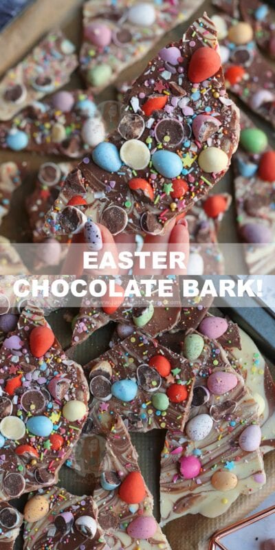 A simple yet delicious idea for Easter – an Easter chocolate bark! Milk and white chocolate topped with your favourite Easter treats!