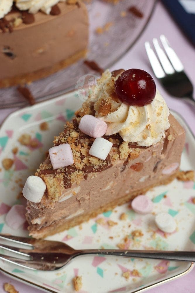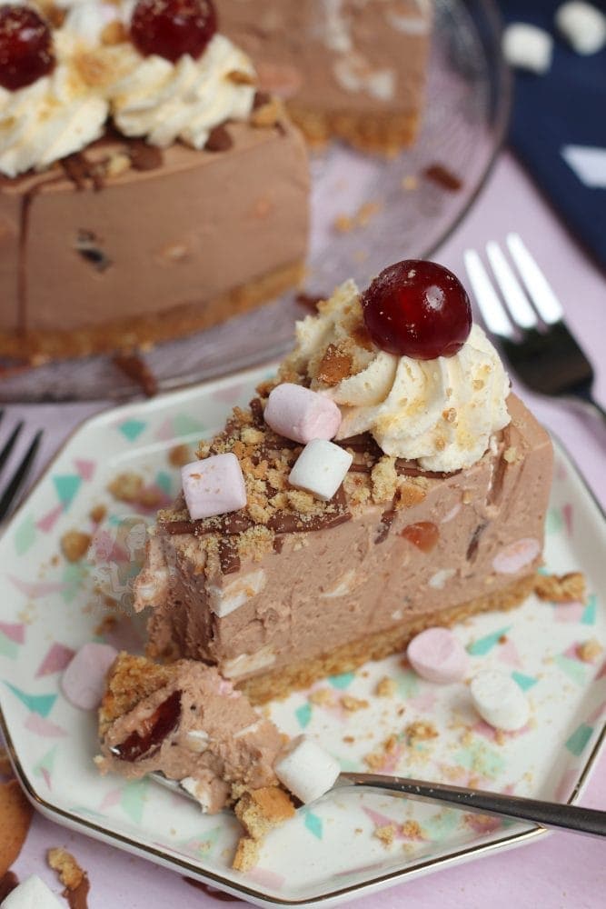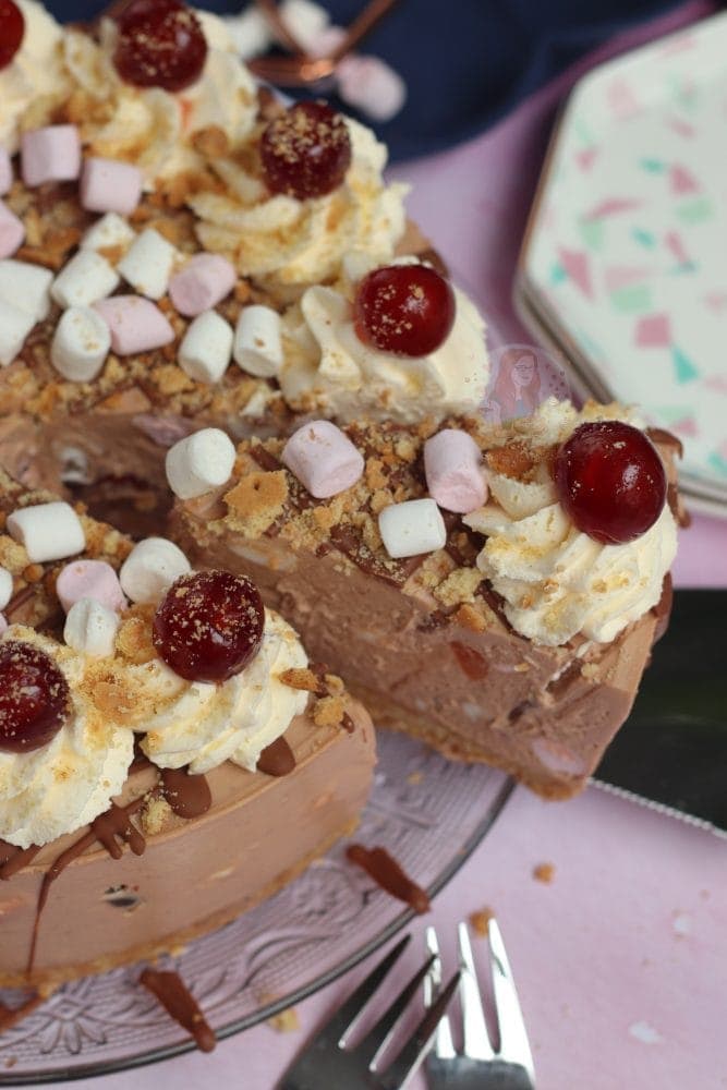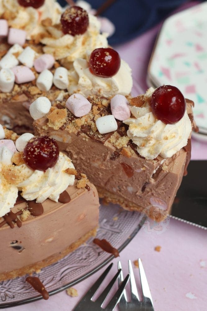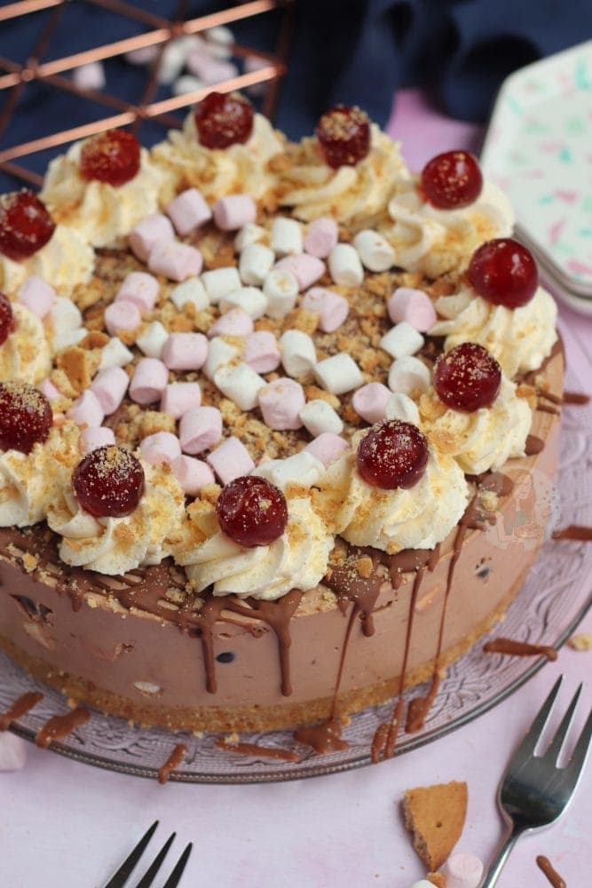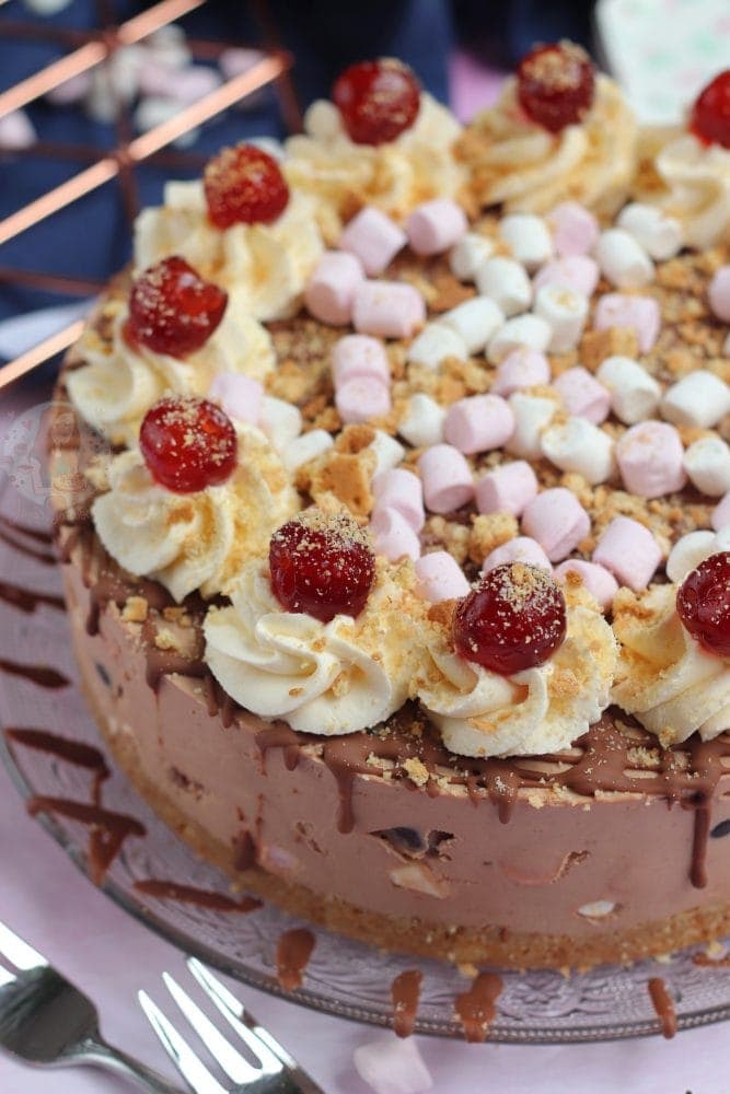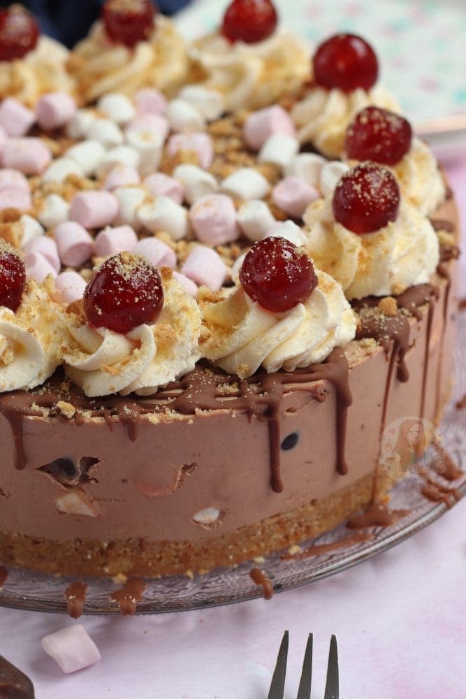 This cheesecake is super delicious with a simple chocolate cheesecake, with mini marshmallows and glacé cherries running through it on top of a simply delicious buttery biscuit base! SO simple!