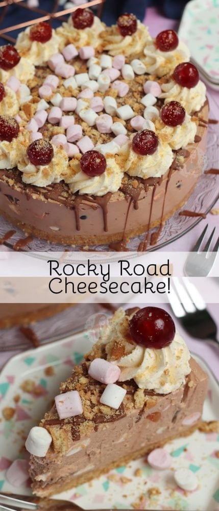 A Delicious and Chocolatey No-Bake Rocky Road Cheesecake with all the Rocky Road goodness inside and out!