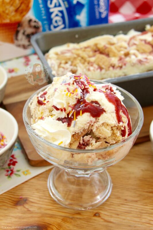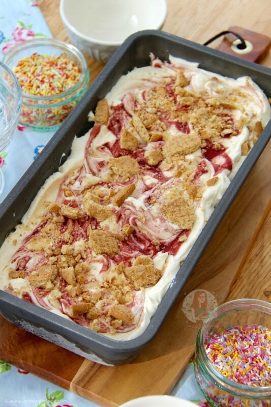 The ice cream itself really is so easy to make – literally whipping the ingredients together till thick, and swirling through the coulis with some crushed biscuits.