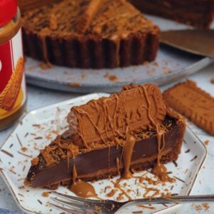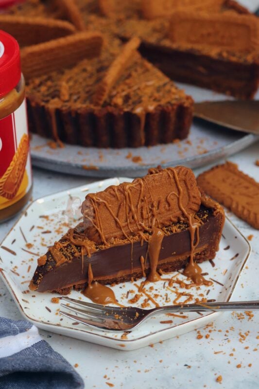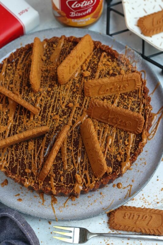 A sweet and spiced no-bake biscoff tart – biscoff biscuit crust, smooth & chocolatey biscoff ganache filling. Heaven!