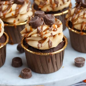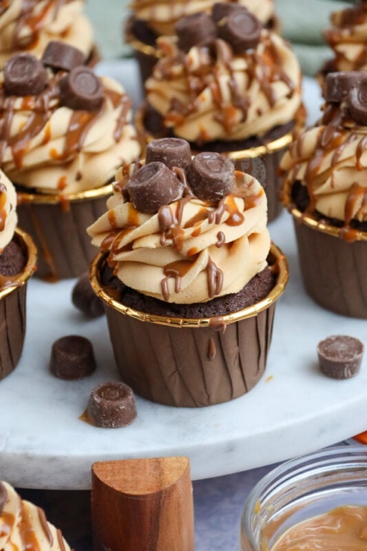 - Loosen the caramel you’re using slightly with a spoon and drizzle over the cupcakes.