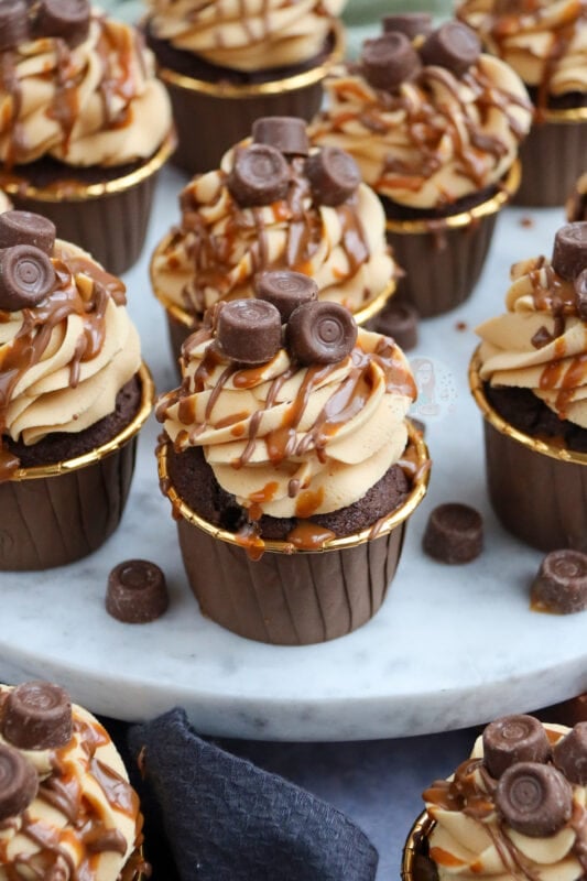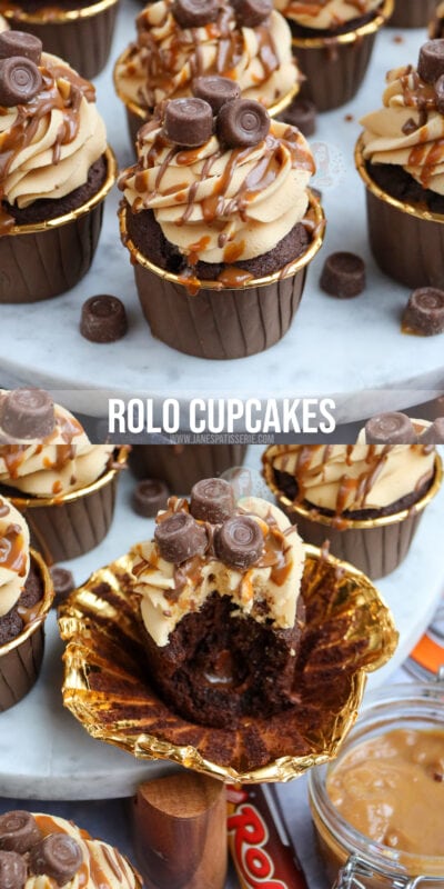 Chocolate cupcakes with a rolo centre, caramel buttercream frosting & even more! Hello heavenly Rolo cupcakes!