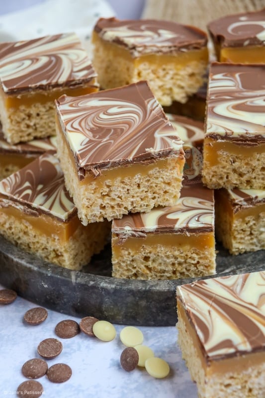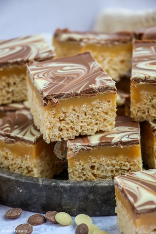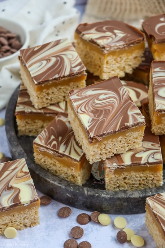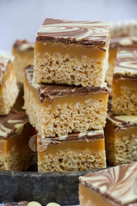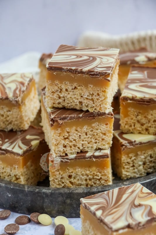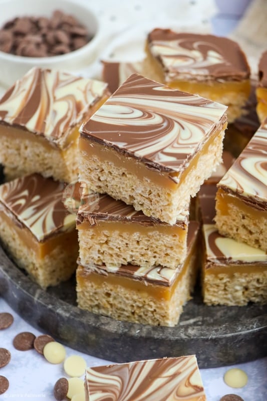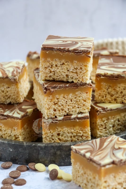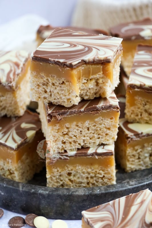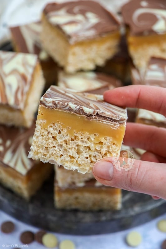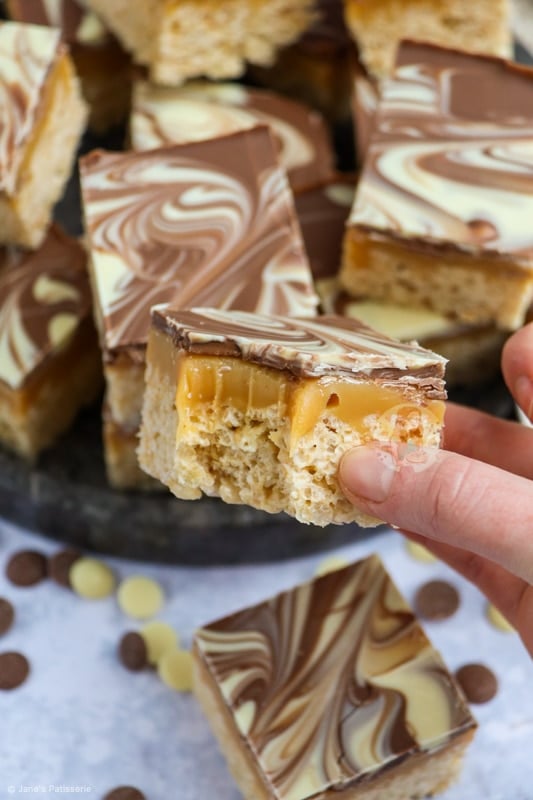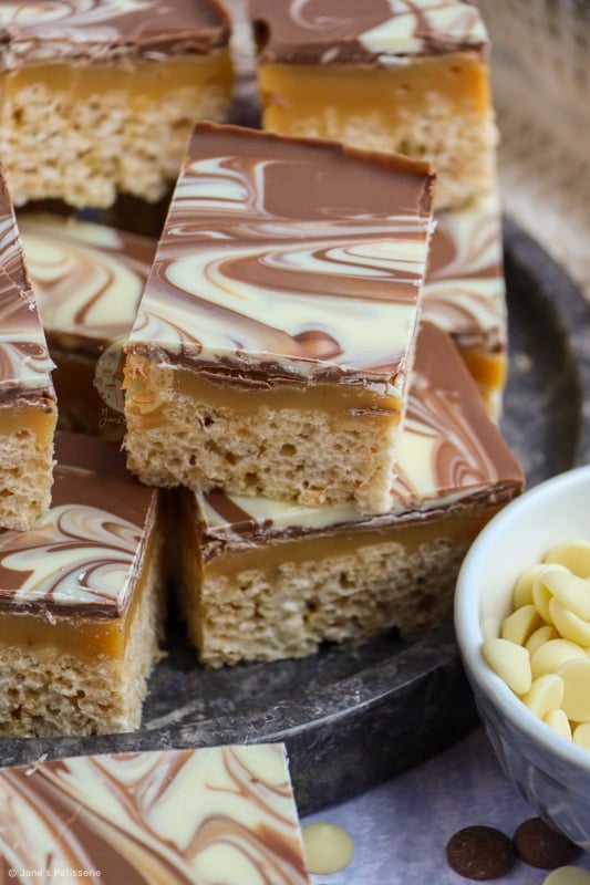 The mixture of having a crunchy and crispy base of essentially a Rice Krispie treat, topped with a delicious homemade caramel, and then topped with swirls of milk and white chocolate is a damn delicious combination.