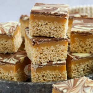 My Mars Bar Crispy Squares, Nutella Rice Krispie Treats, and my Biscoff Rice Krispie Treats have always proved popular with families and people baking for bake sales as they’re easy, and people of all ages love them. And they’re damn tasty! These ones however?! They do level up ever so slightly.