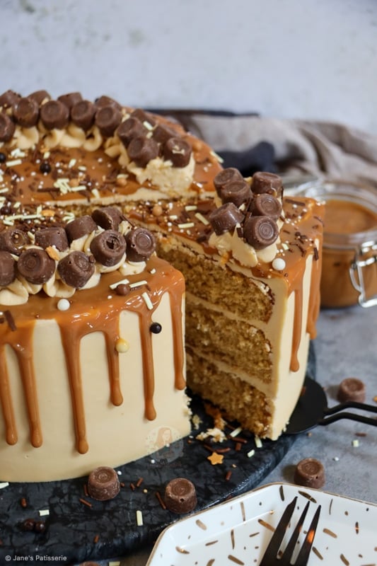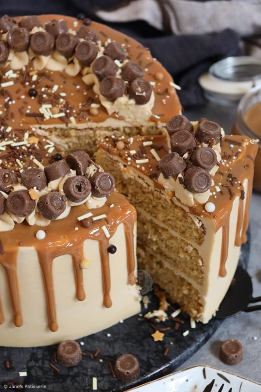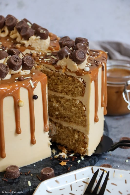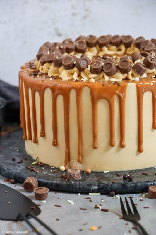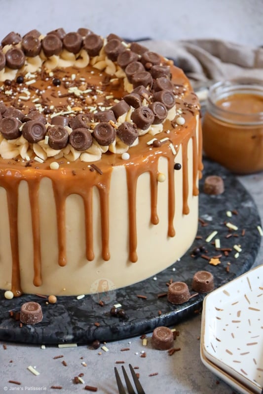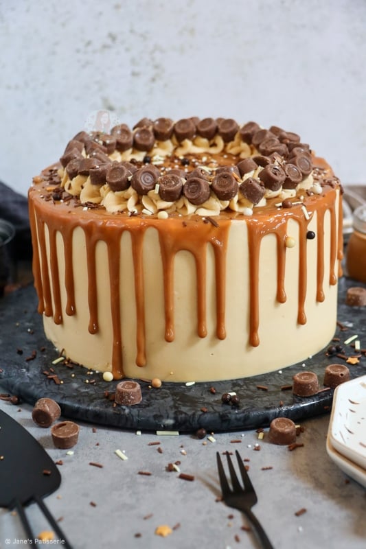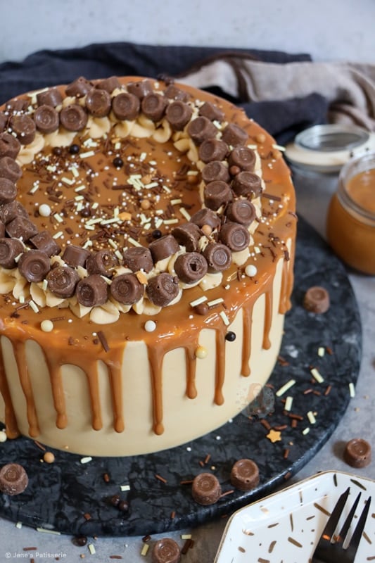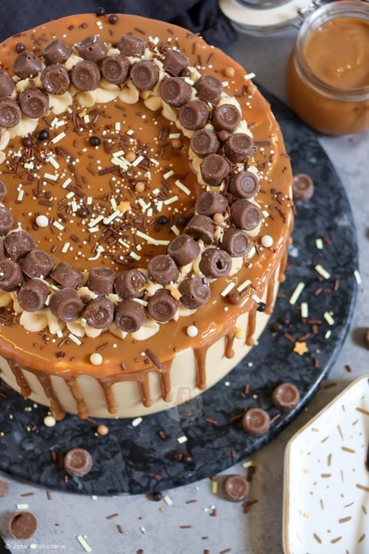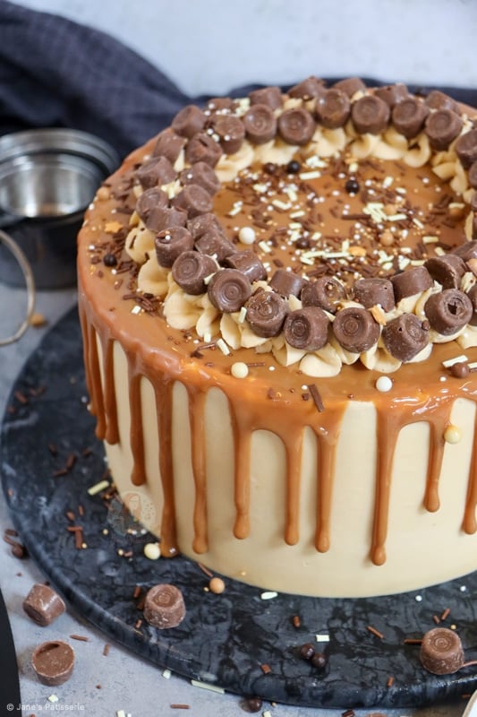 I decided to add the stereotypical ‘Jane’s Patisserie’ flair to my cake by piping round the cake with some of the leftover buttercream, adding loads of Rolos, and then some fudge and chocolate sprinkles. I just can’t resist it!