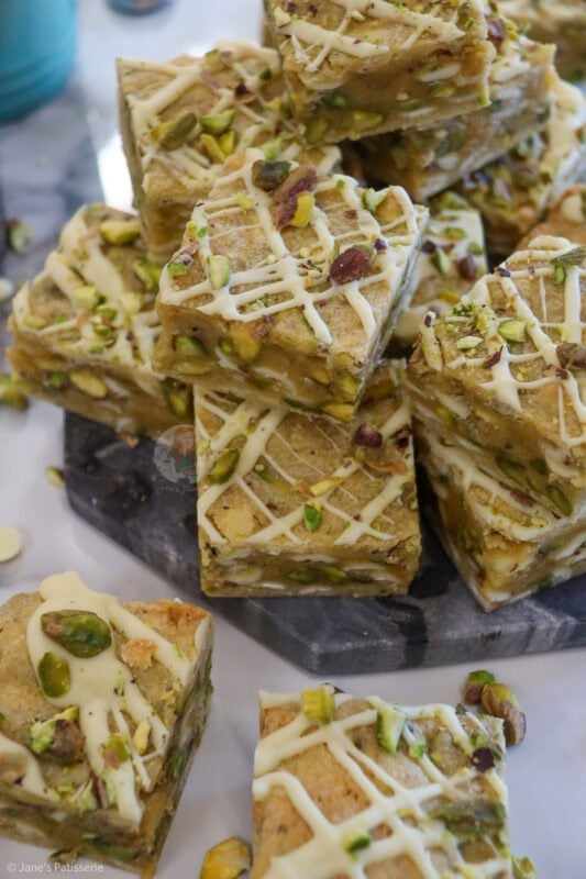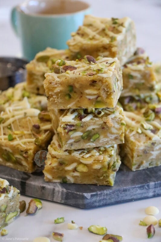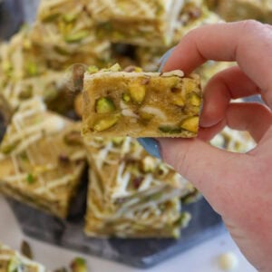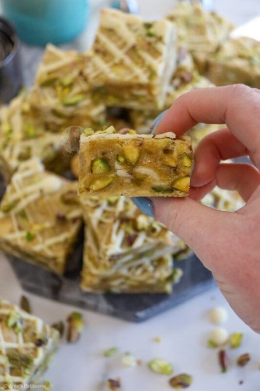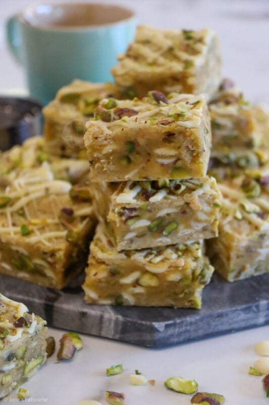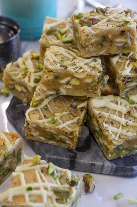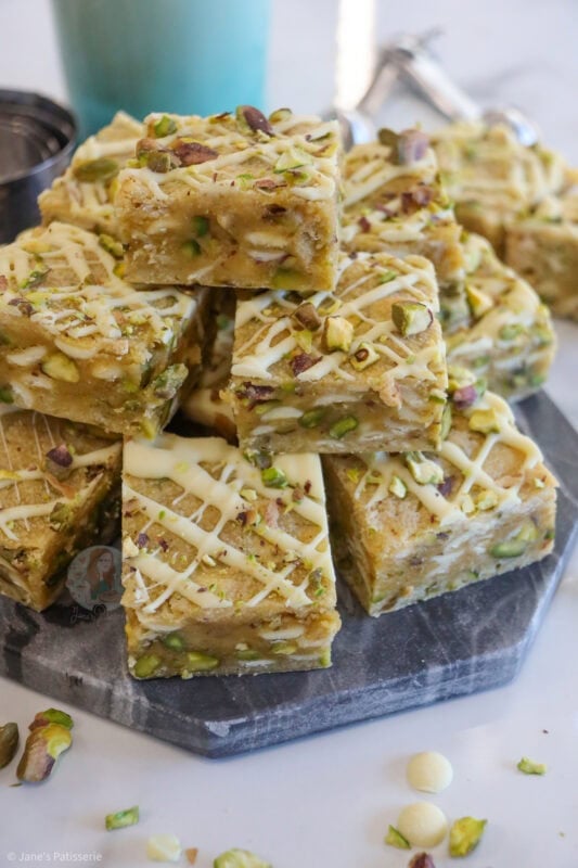 I posted my no-bake white chocolate pistachio cheesecake and it’s always been a hit week on week. My white chocolate & pistachio cake has always been popular around the holidays and such, particularly for showstoppers. So, white chocolate and pistachio blondies were born. I just can’t even cope, they’re so delicious
