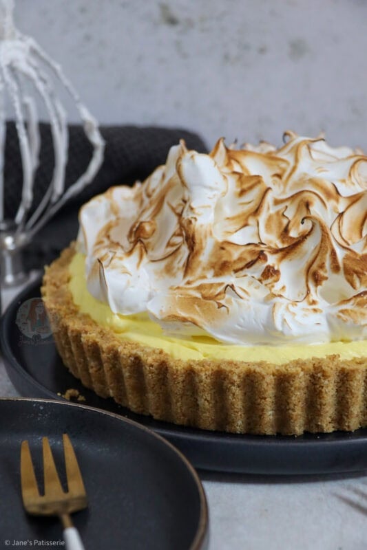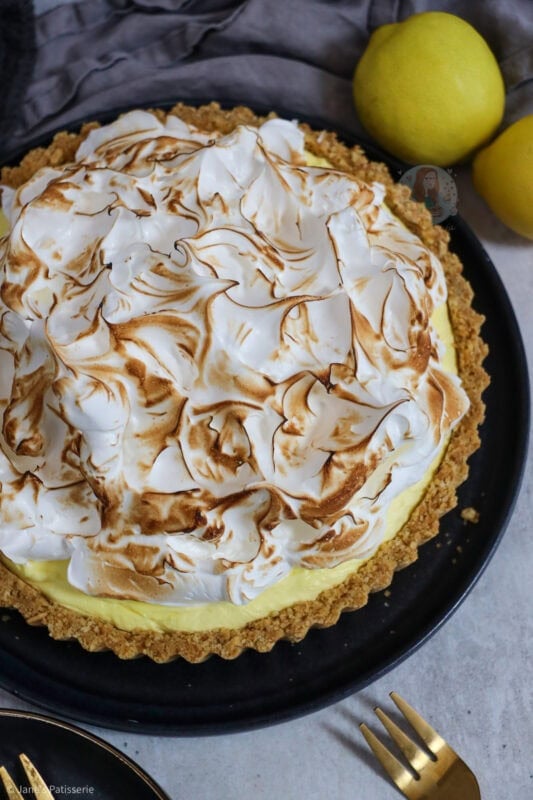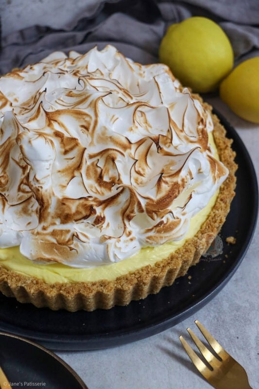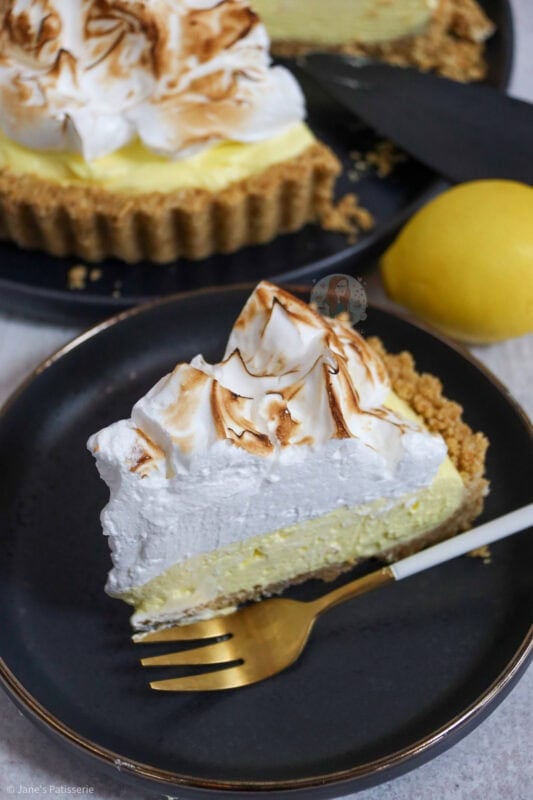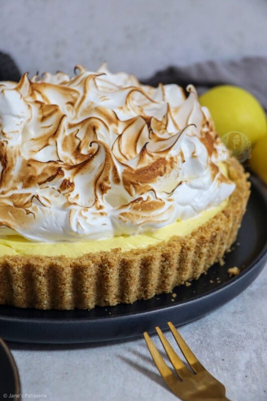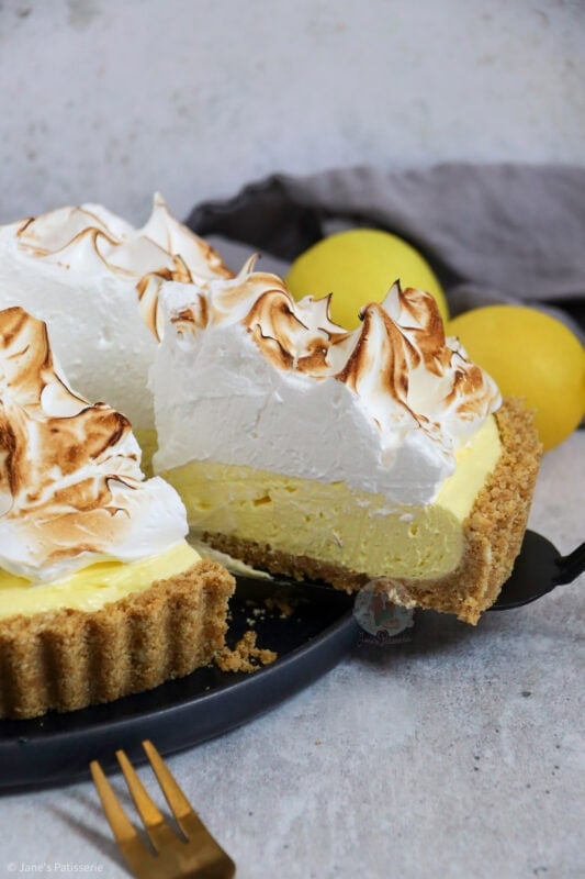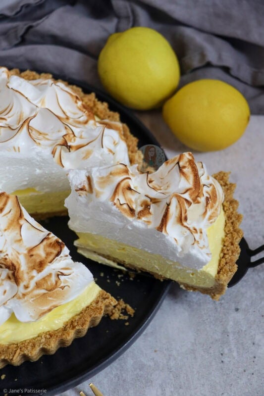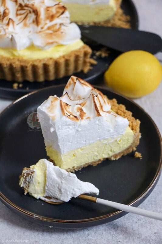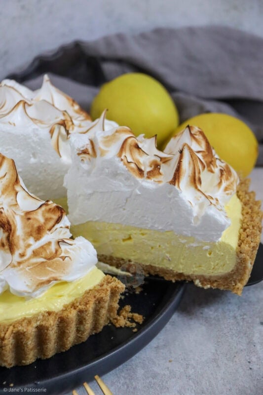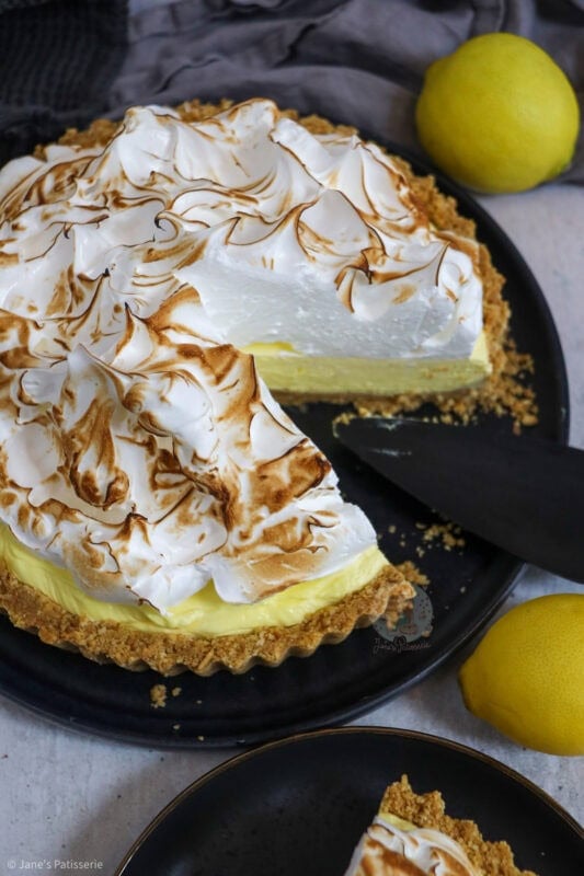 The combination typically of pastry, a set lemon curd and a meringue topping is just iconic and absolutely out of this world, and I adore it. To make it fit the cheesecake theme a bit more, I use a biscuit base instead of pastry, a lemon cheesecake filling, but then also a meringue topping. It sounds a lot, but trust me, it’s just delicious.