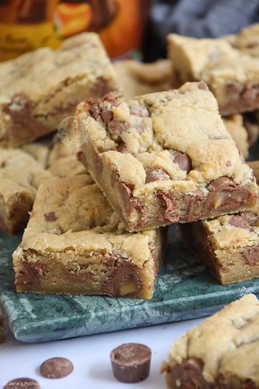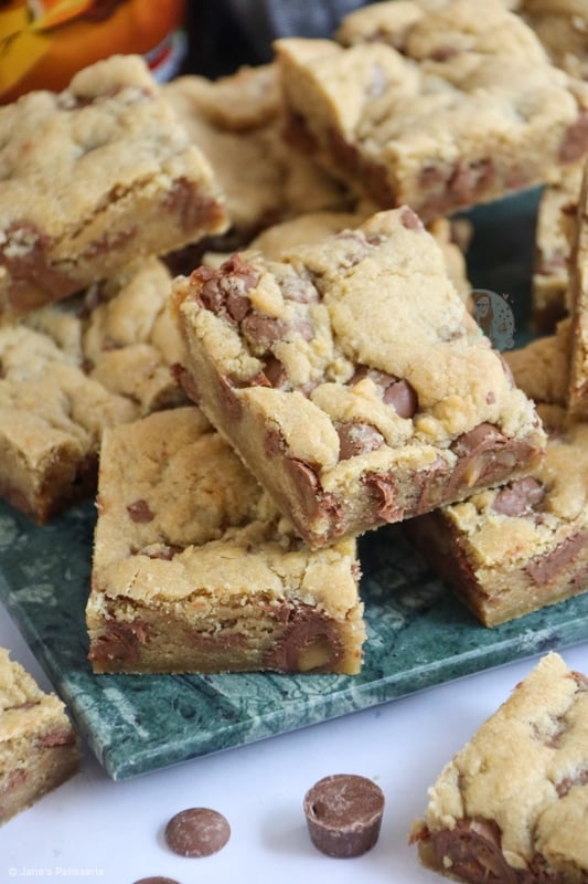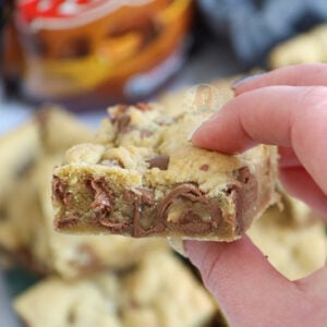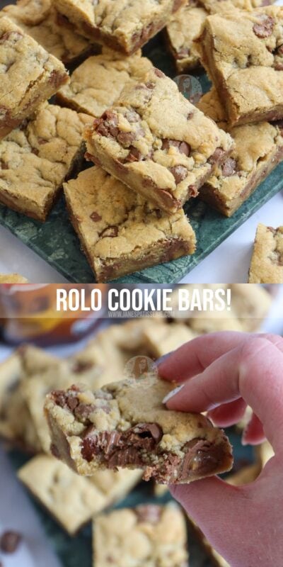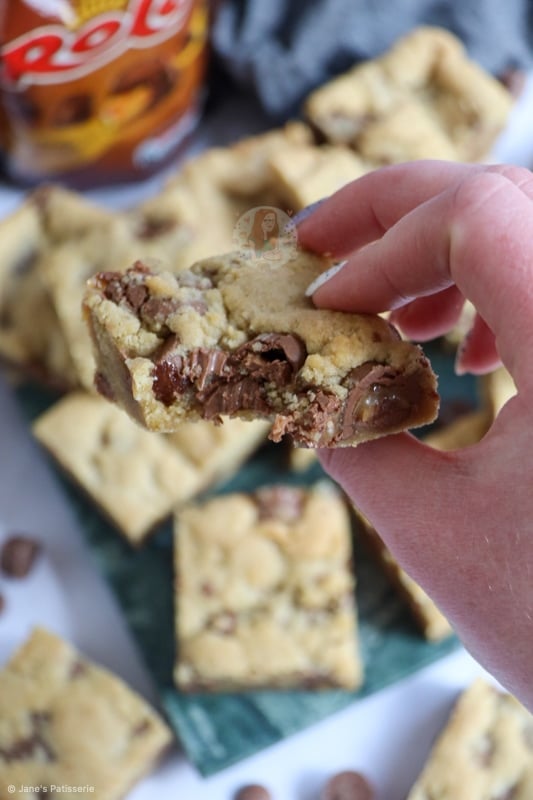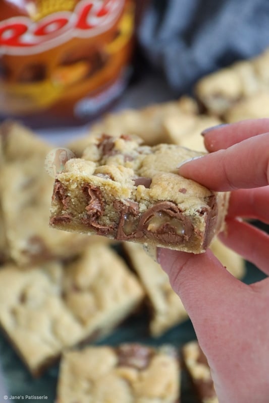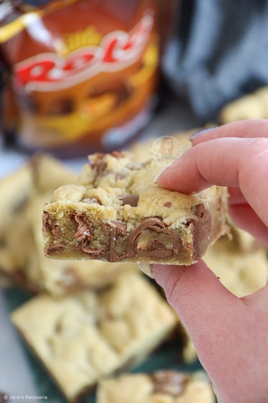 These delicious bars are super gooey decadent cookie style. The caramel in the Rolos makes the cookie bars softer and sweeter, whilst also still having little pockets of caramel throughout.