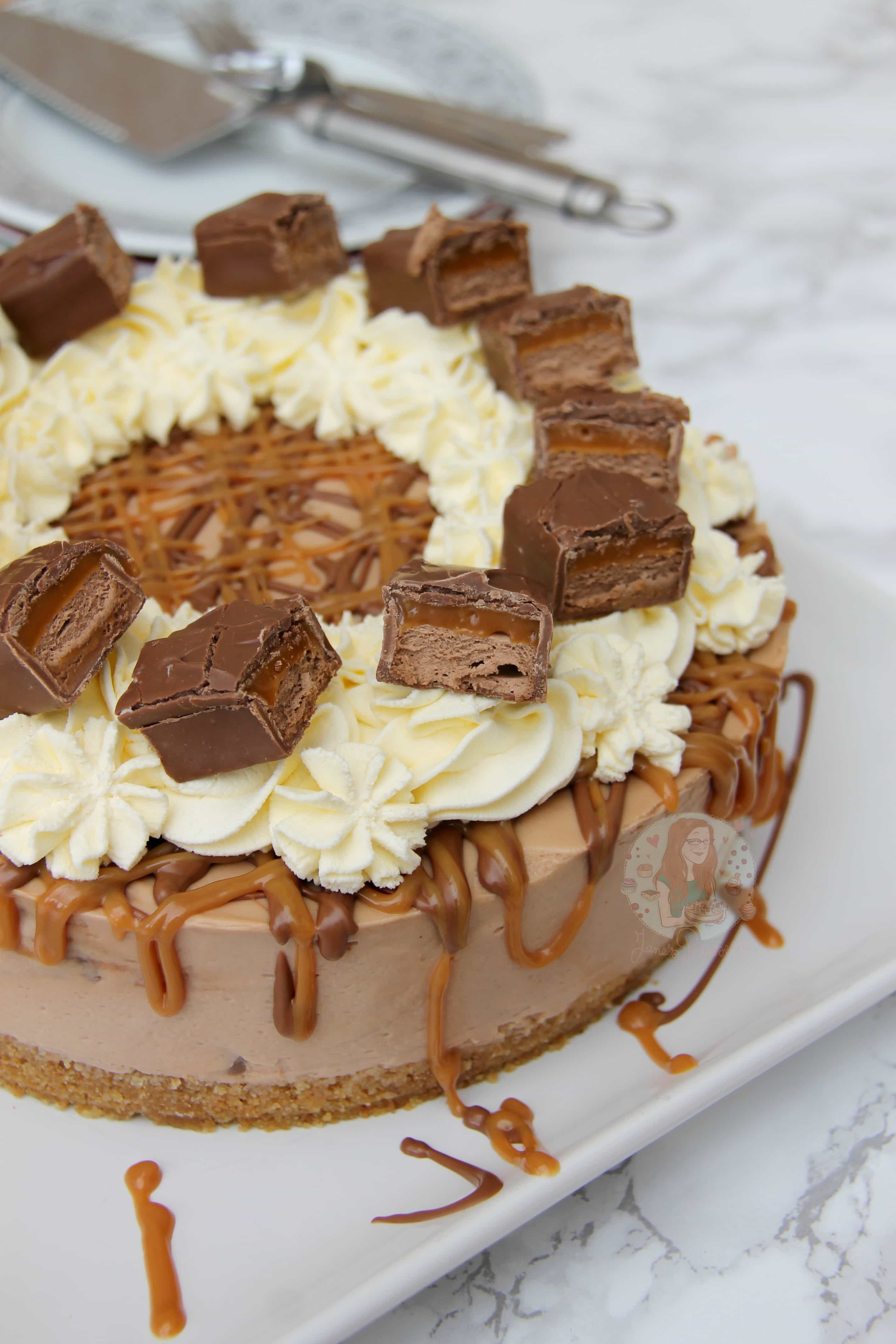 - Remove the cheesecake from the tin, drizzle over the melted milk chocolate, drizzle over the caramel, and decorate with the whipped cream, and some pieces of Mars Bar!