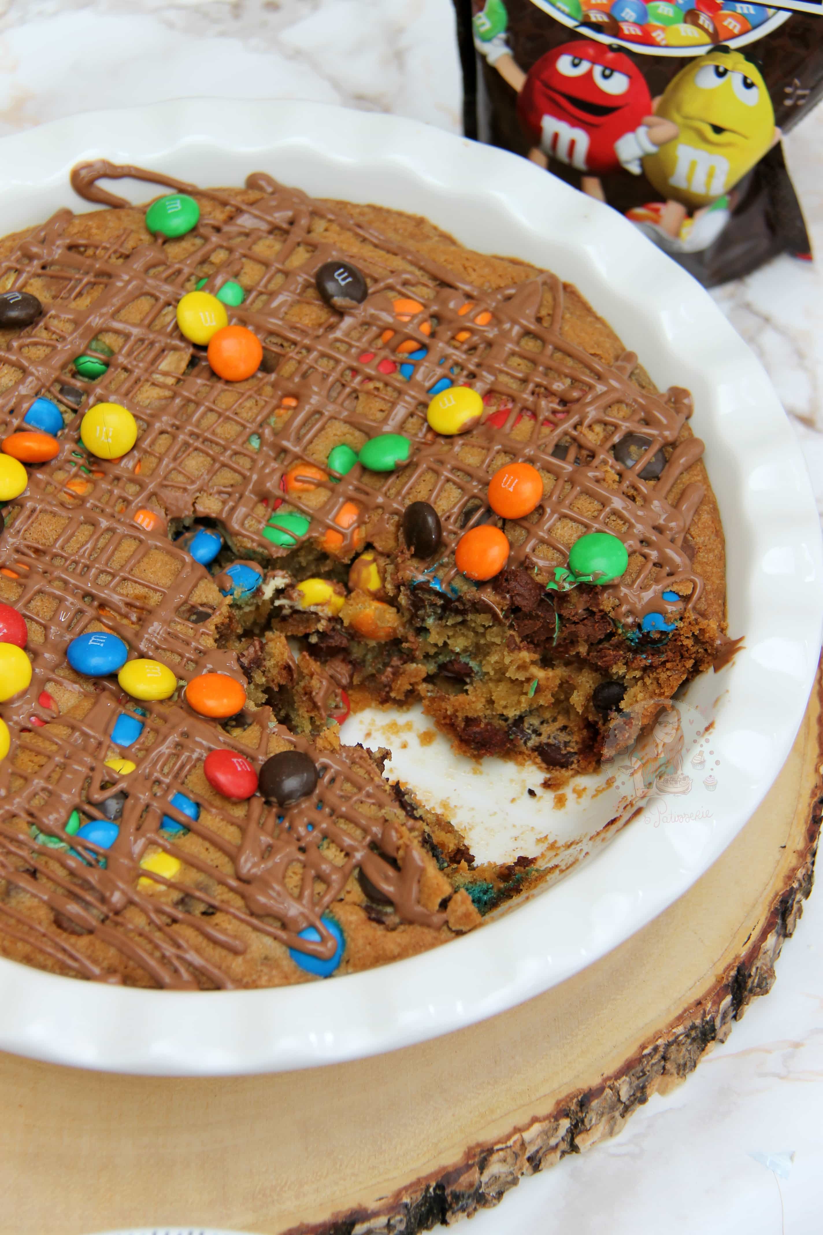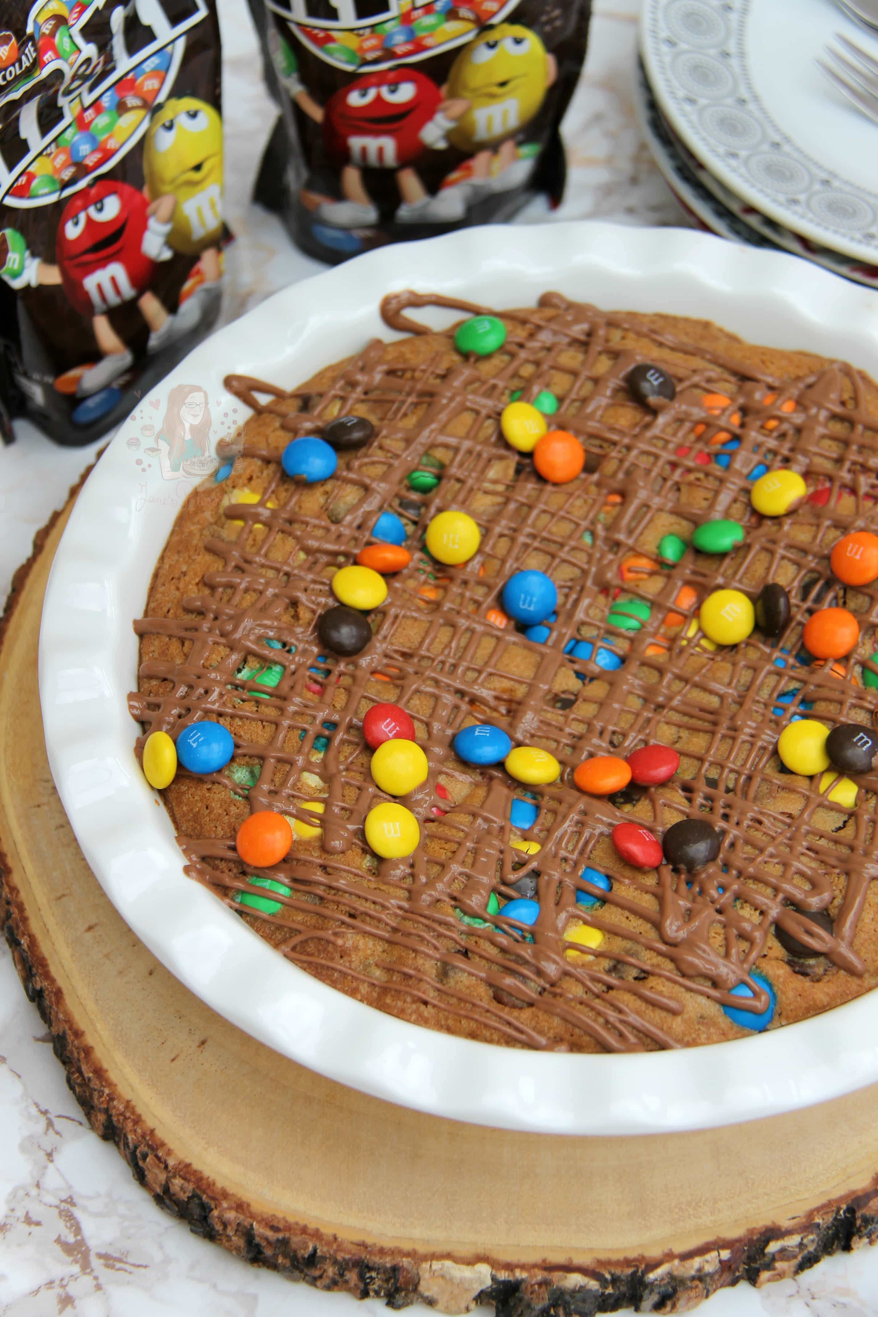- Add in 85% of your M&Ms and fold them through. Spread the cookie dough into the pie dish, and add the last of the sweets on top for decoration. You don’t have to do this, but I think it looks far nicer!