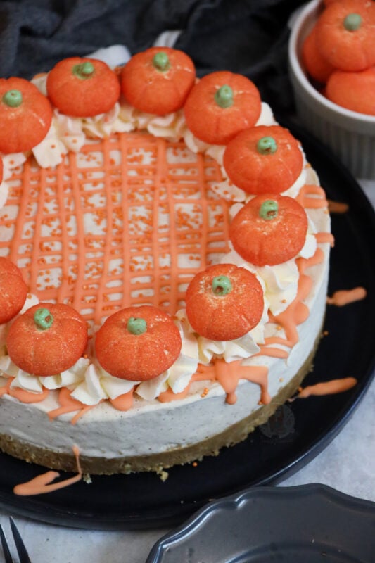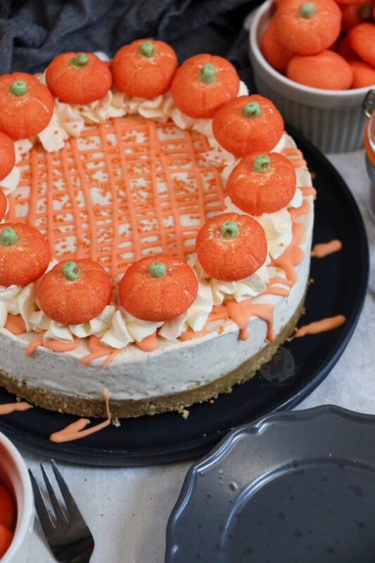 - Whip up some double cream with the icing sugar and pipe little pirouettes of cream around the edge of the cheesecake, and add on the marshmallow pumpkins.