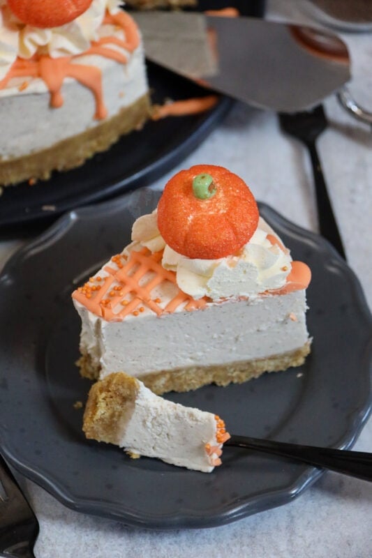 Perfect treat for Halloween and Autumn, a no-bake pumpkin spice cheesecake. DIY pumpkin spice, and an easy vanilla cheesecake are perfect together!