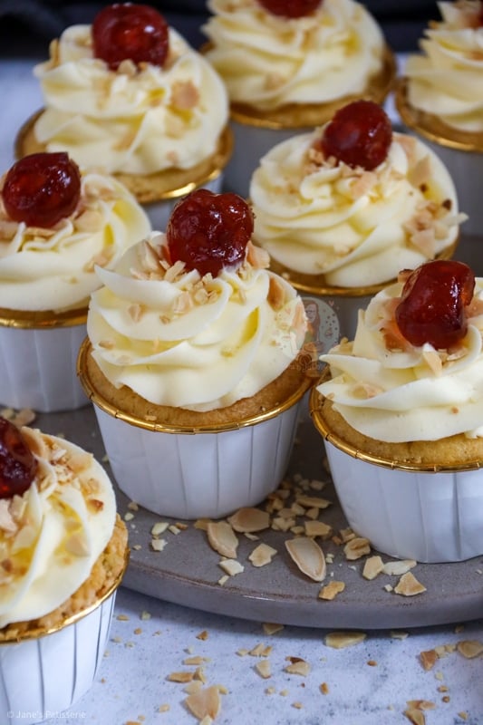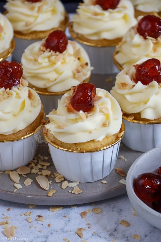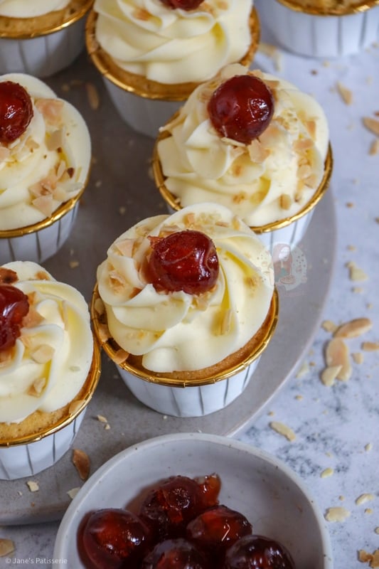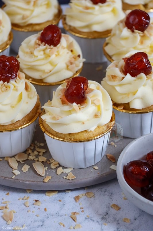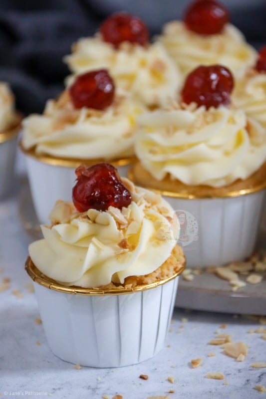 I used my favourite piping tip as always and swirled the frosting onto the baked, cooled and filled cupcakes – and decorated with some toasted flaked almonds, and a glacé cherry of course. You can toast the almonds really easily by adding them to a dry pan on medium heat, and moving them about until they golden nicely.