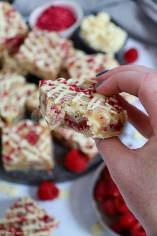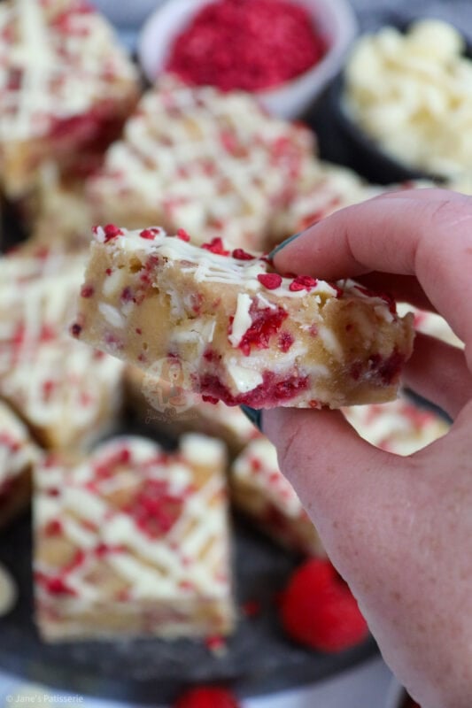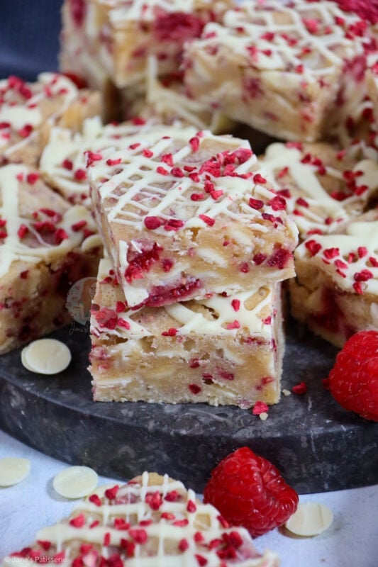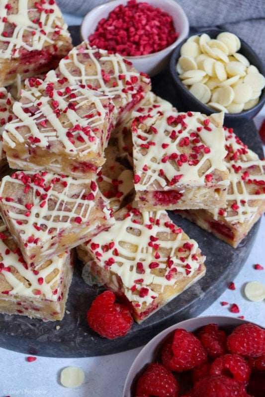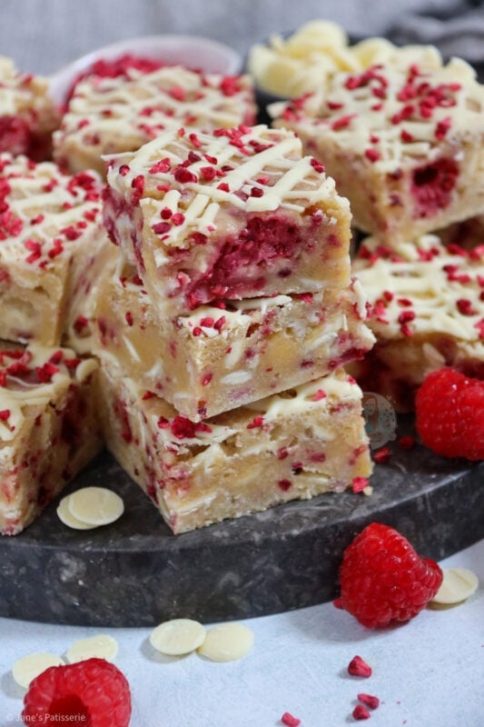 I am obsessed with all things chocolate as we all know, but white chocolate is such a good pairing chocolate to go with so many different things. I adore all things so having these blondies is just the best of the best. My white chocolate and raspberry loaf is such a popular bake, as well as my white chocolate & raspberry tart.