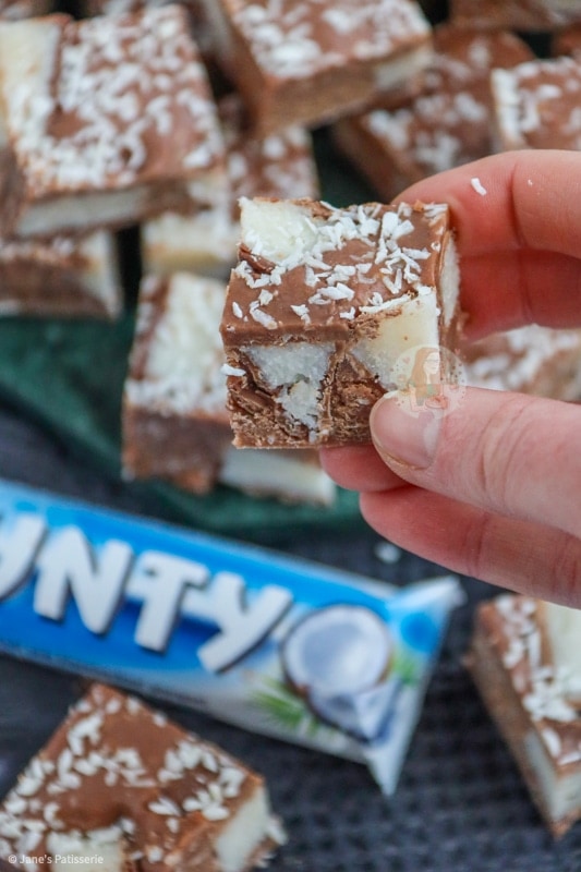 I based it on a similar recipe to my Speculoos/Biscoff Cookie Butter Fudge and Terry’s Chocolate Orange Fudge and it worked so much better than I thought it would! I used a mixture of condensed milk, milk chocolate, desiccated coconut and bounty bars to make this delicious fudge and I am in love.