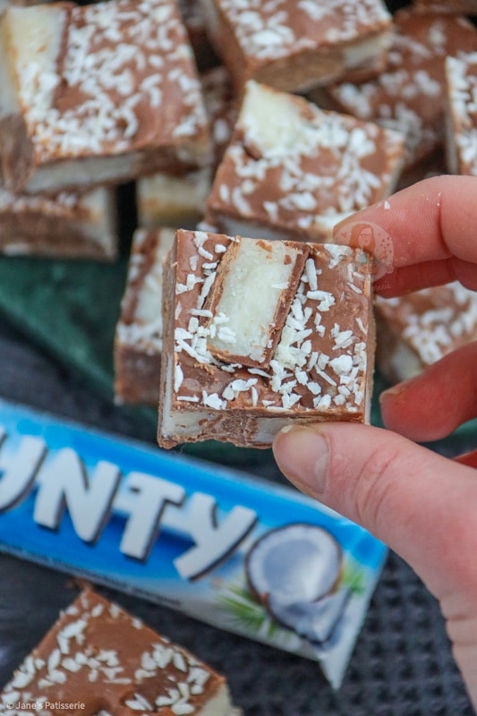 - Recipe updated January 2022 - the original recipe contained 397 condensed milk, 500g milk chocolate, 200g bounty spread, 100g icing sugar, 400g bounty bars and a sprinkling of desiccated coconut.